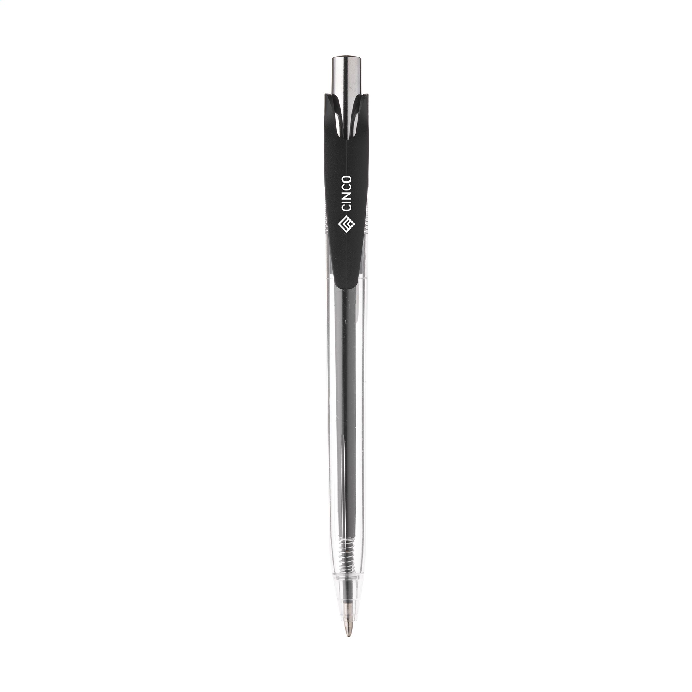 Blauwschrijvende balpen met transparante houder, opvallende en modern vormgegeven clip, in het oog springende vulling in de kleur van de clip en een kleuraccent in de drukknop.