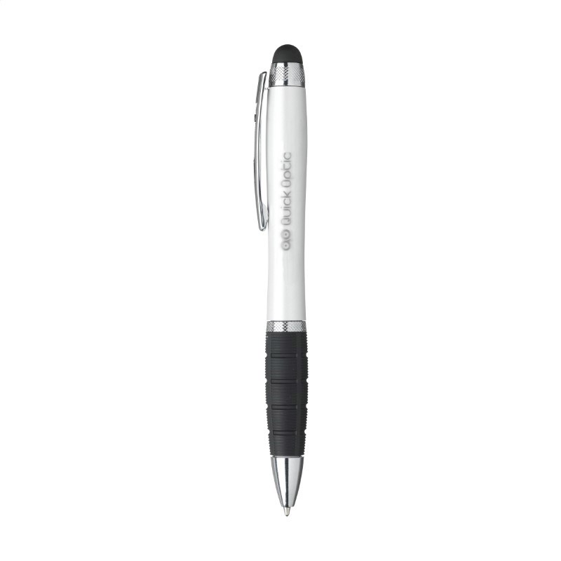 Blauwschrijvene balpen voorzien van een rubberen top/pointer. Perfect voor het bedienen van touchscreens (zoals iPhone/iPad). Met metallic look houder, zilverkleurige accenten, fraaie, metalen clip, gripvast, rubberen voorstuk en draaikliksysteem. Incl. batterijen.
