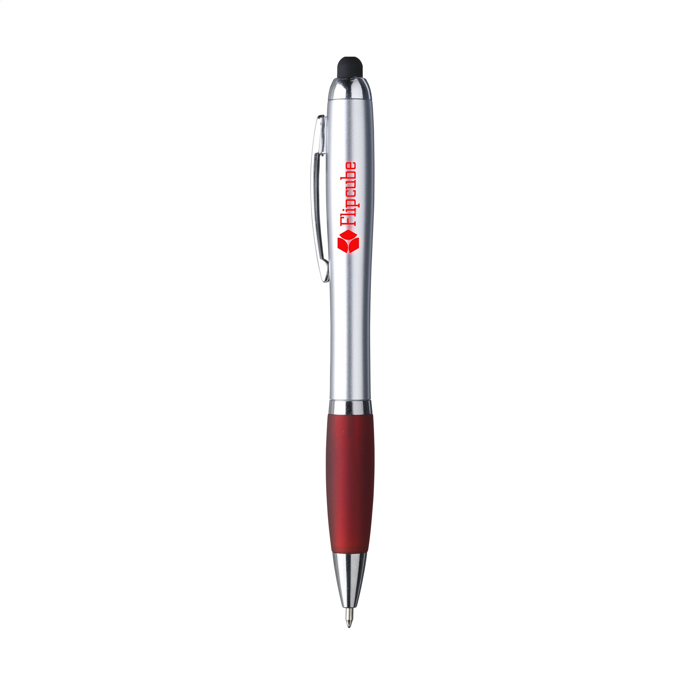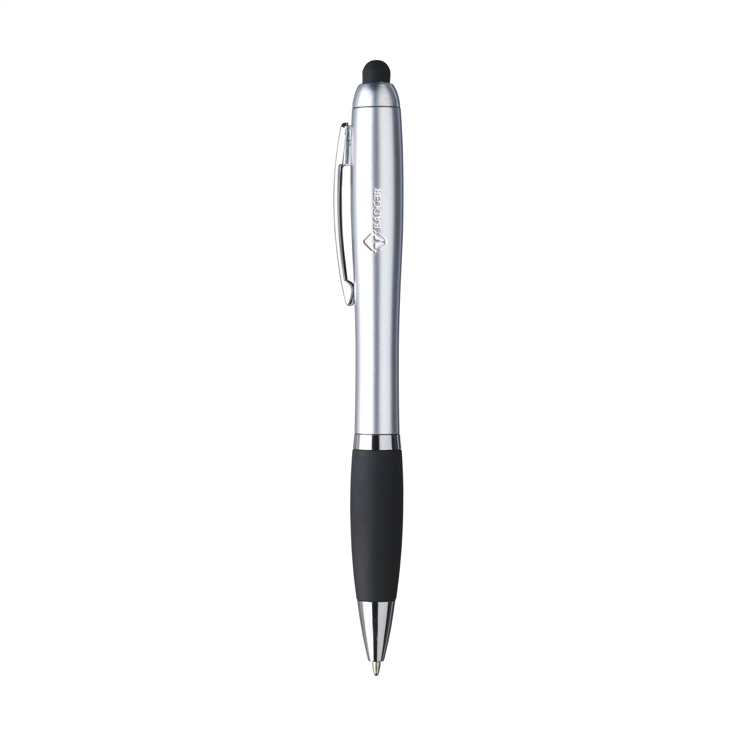 Blauwschrijvende balpen voorzien van een rubberen top/pointer. Met één druk op de pointer wordt het logo in de houder opvallend helder verlicht in een kleur die matcht met de gekleurde, gripvaste houder. Deze pen is perfect voor het bedienen van touchscreens (zoals iPhone/iPad). Met zilverkleurige accenten, een fraaie metalen clip en draaikliksysteem. Inclusief beschermdop.
