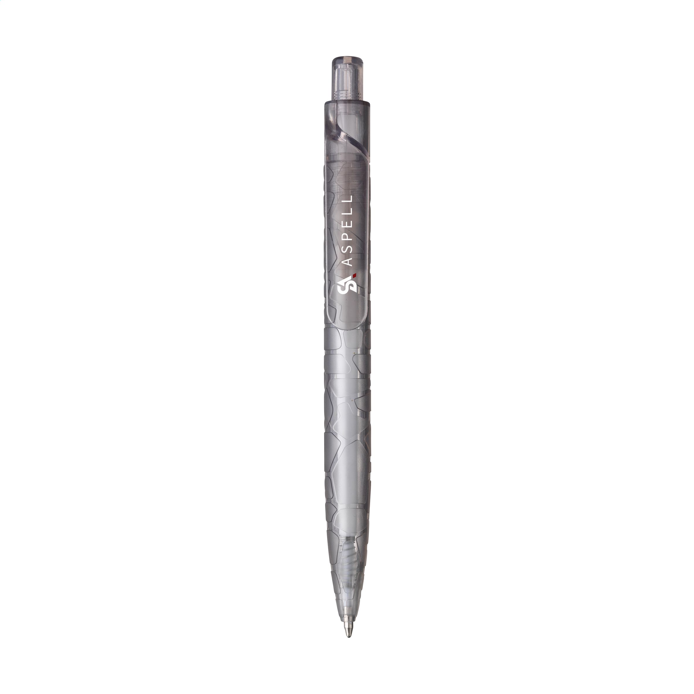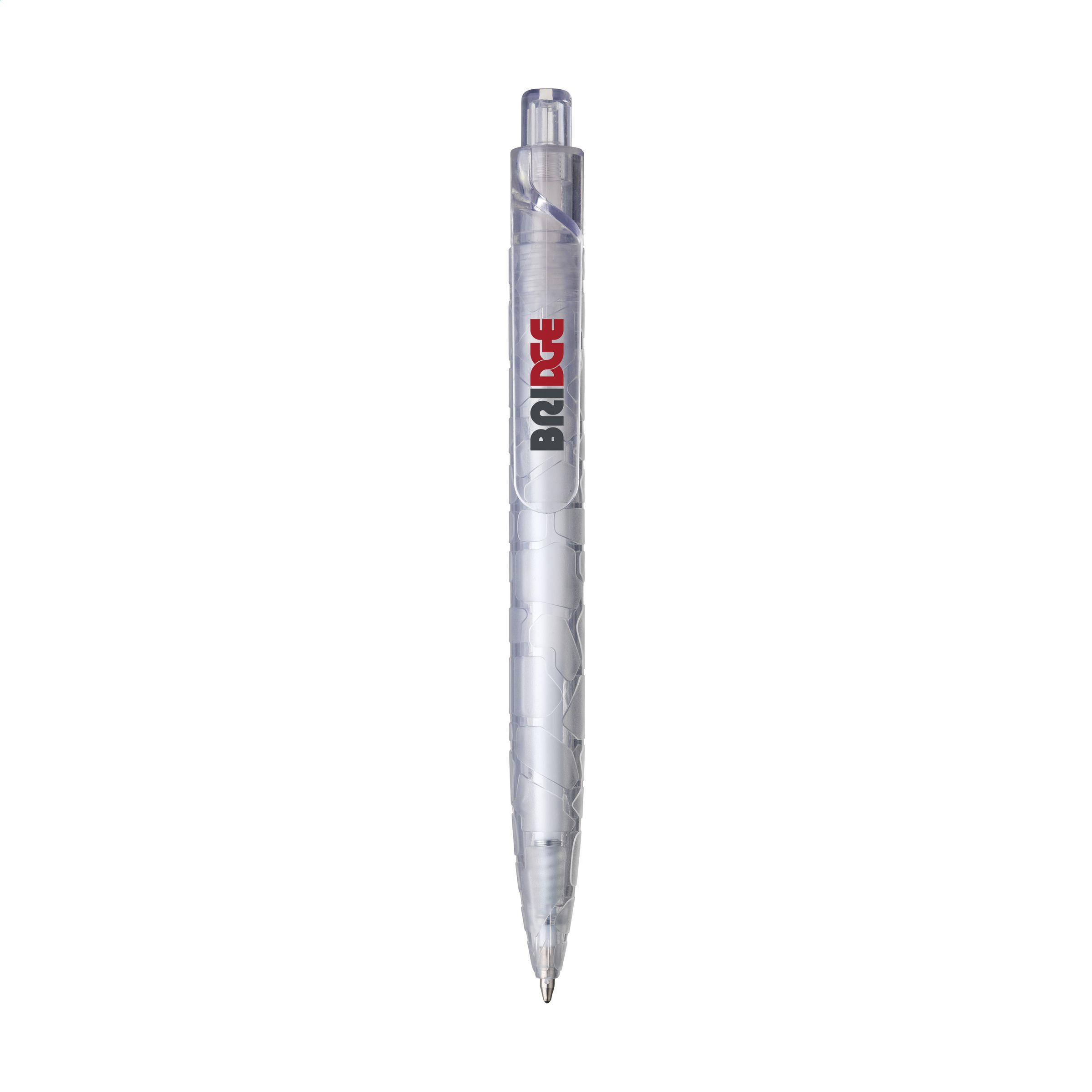 Blauwschrijvende RPET balpen, vrijwel geheel gemaakt van gerecyclede PET-flessen. De houder heeft een opvallend reliëf patroon. De royale clip is uitermate geschikt voor een opdruk en valt direct op.