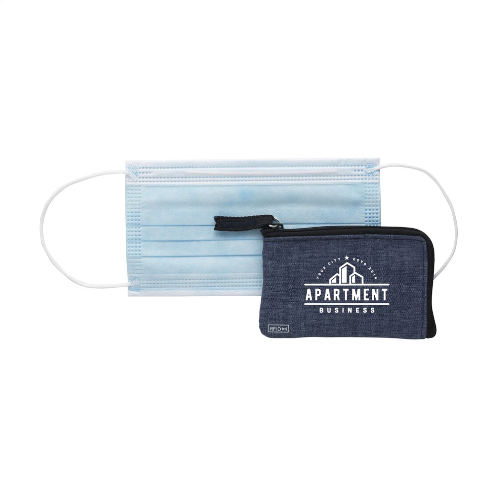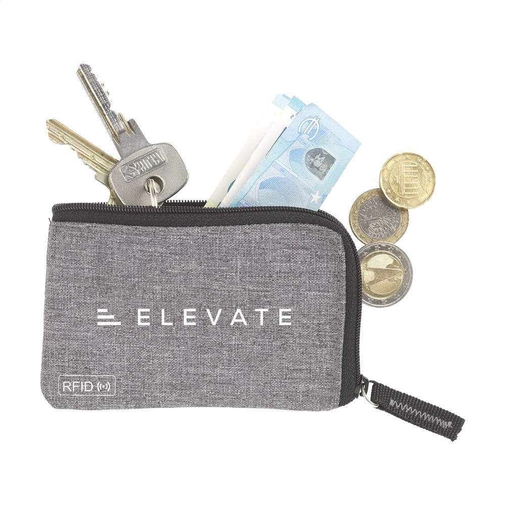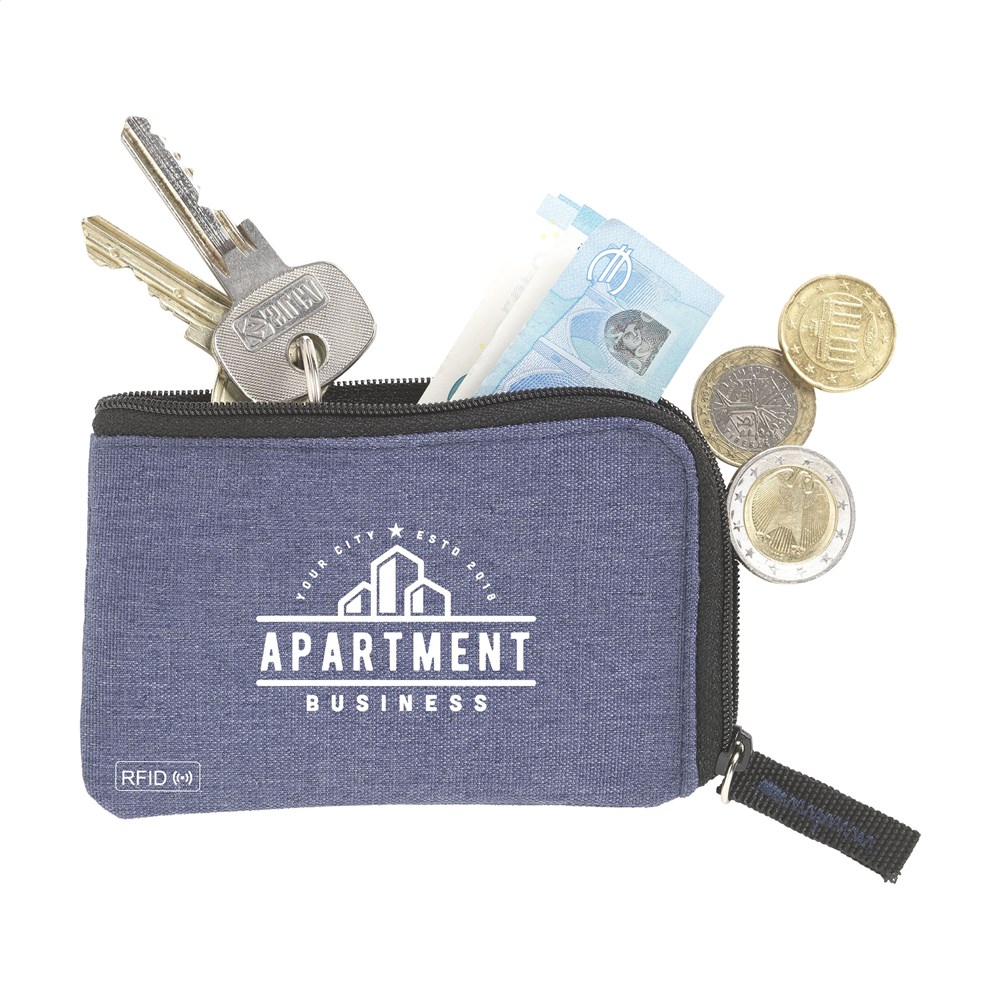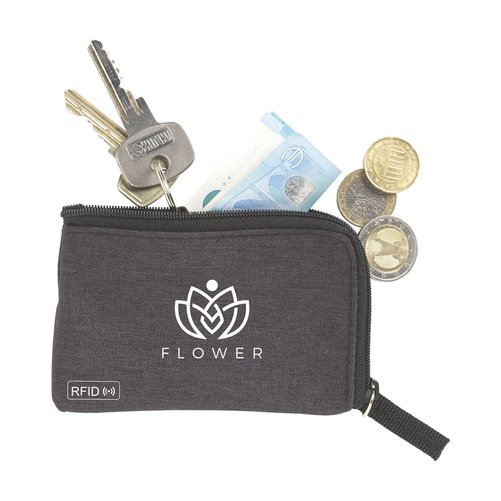 RFID sleutelbeurs van geweven polyester, nylon gevoerd. Met rits, RVS sleutelring en extra insteekvak voor pasjes. De RFID beschermingstechnologie beschermt de pasjes tegen skimmen en identiteitsdiefstal. Ook geschikt als opbergetui voor het veilig meenemen van een mondkapje.