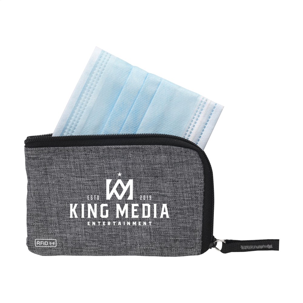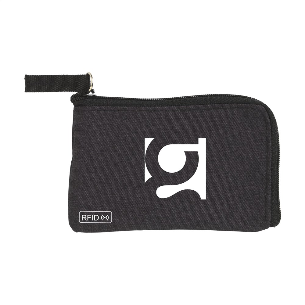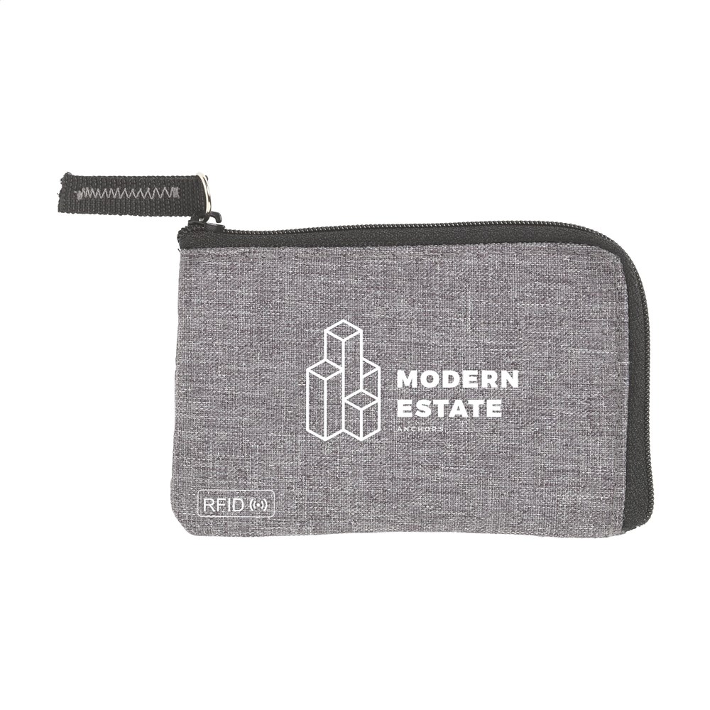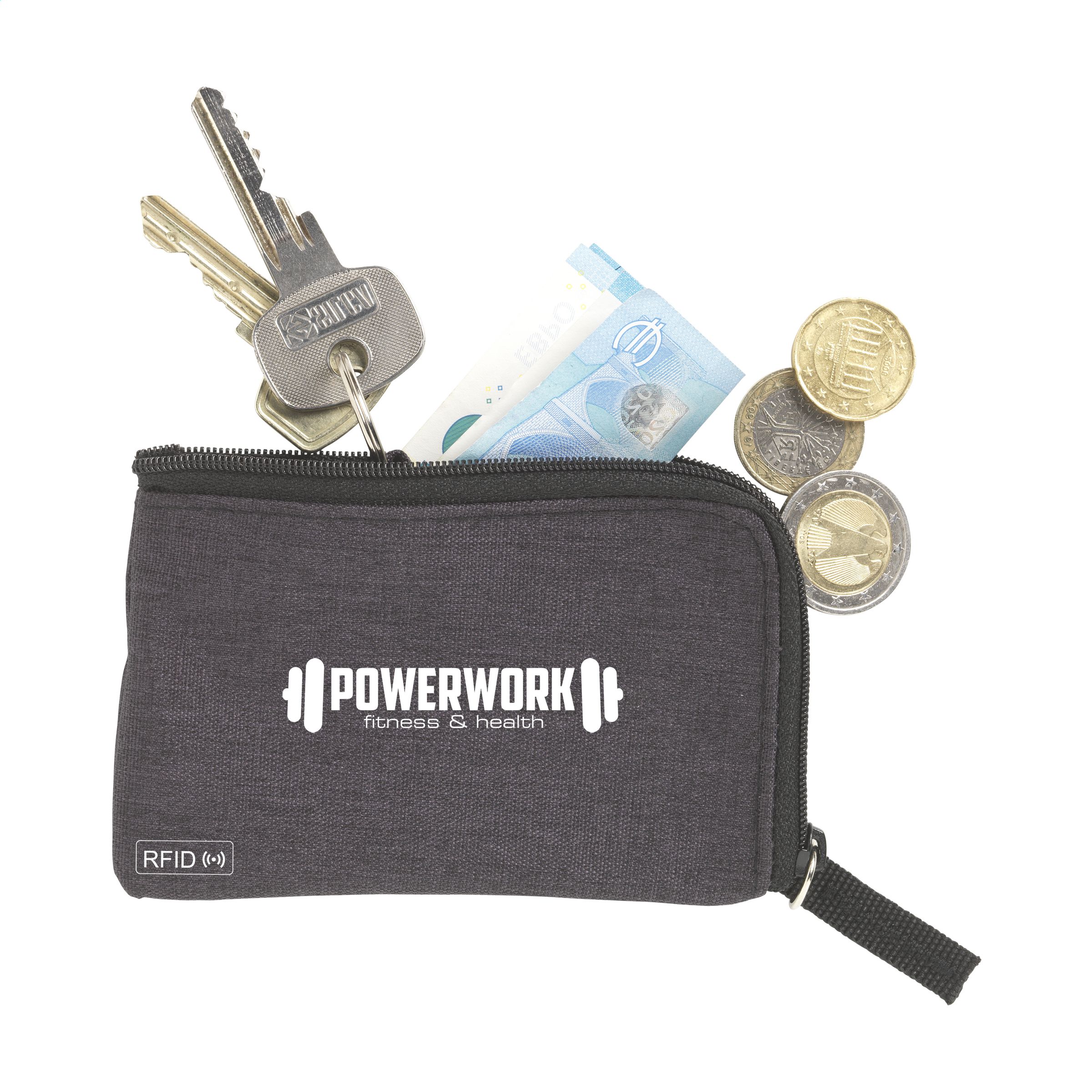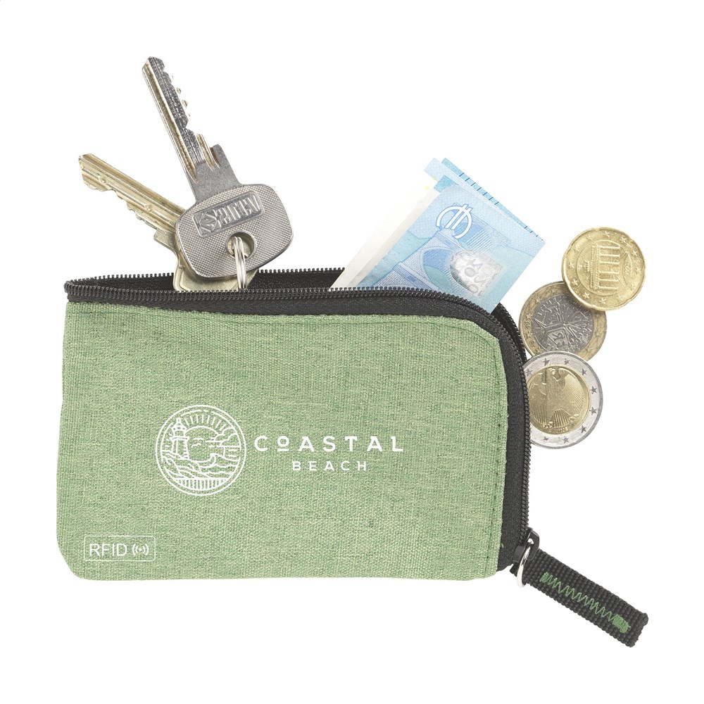 RFID sleutelbeurs van geweven polyester, nylon gevoerd. Met rits, RVS sleutelring en extra insteekvak voor pasjes. De RFID beschermingstechnologie beschermt de pasjes tegen skimmen en identiteitsdiefstal. Ook geschikt als opbergetui voor het veilig meenemen van een mondkapje.