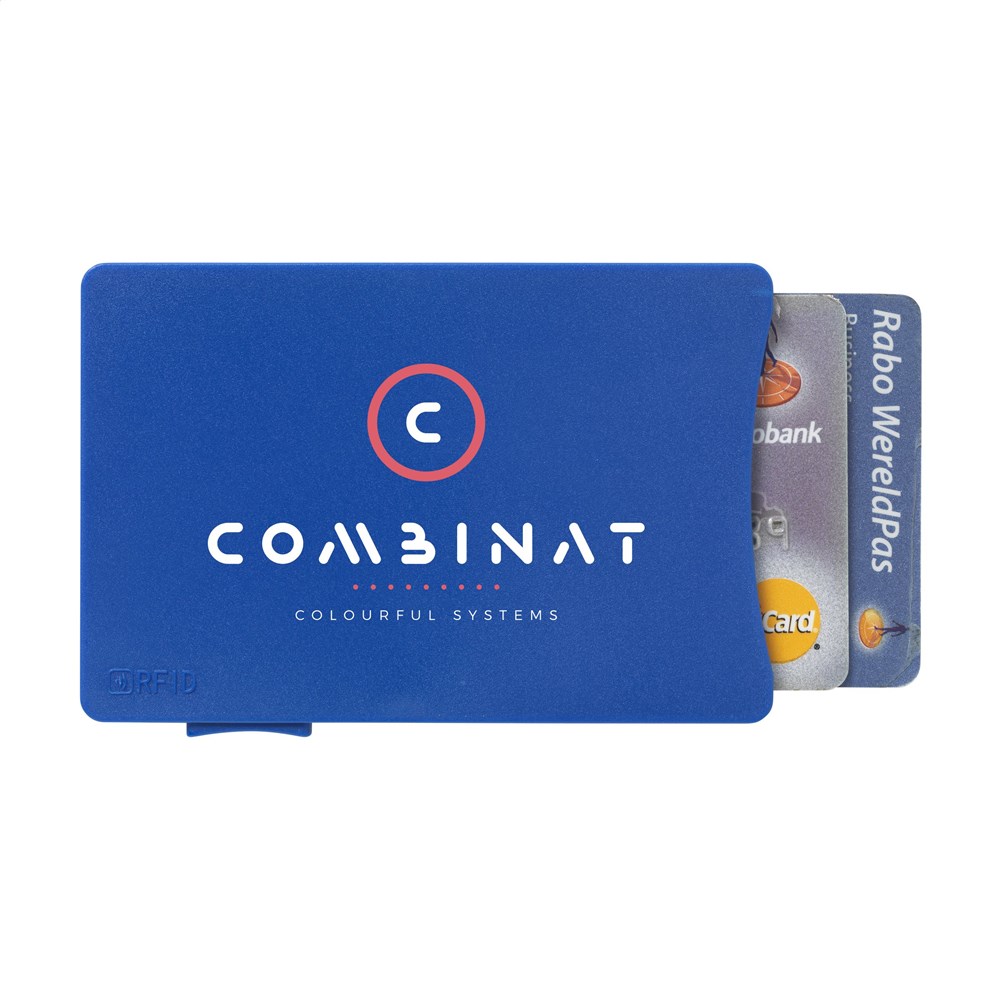 Praktische RFID blokkerende multi-kaarthouder van kunststof met handig schuif-systeem. Beschermt pasjes tegen onvrijwillig, digitaal uitlezen van identiteitskaarten, creditcards en bankpasjes. Geschikt voor 3 passen.