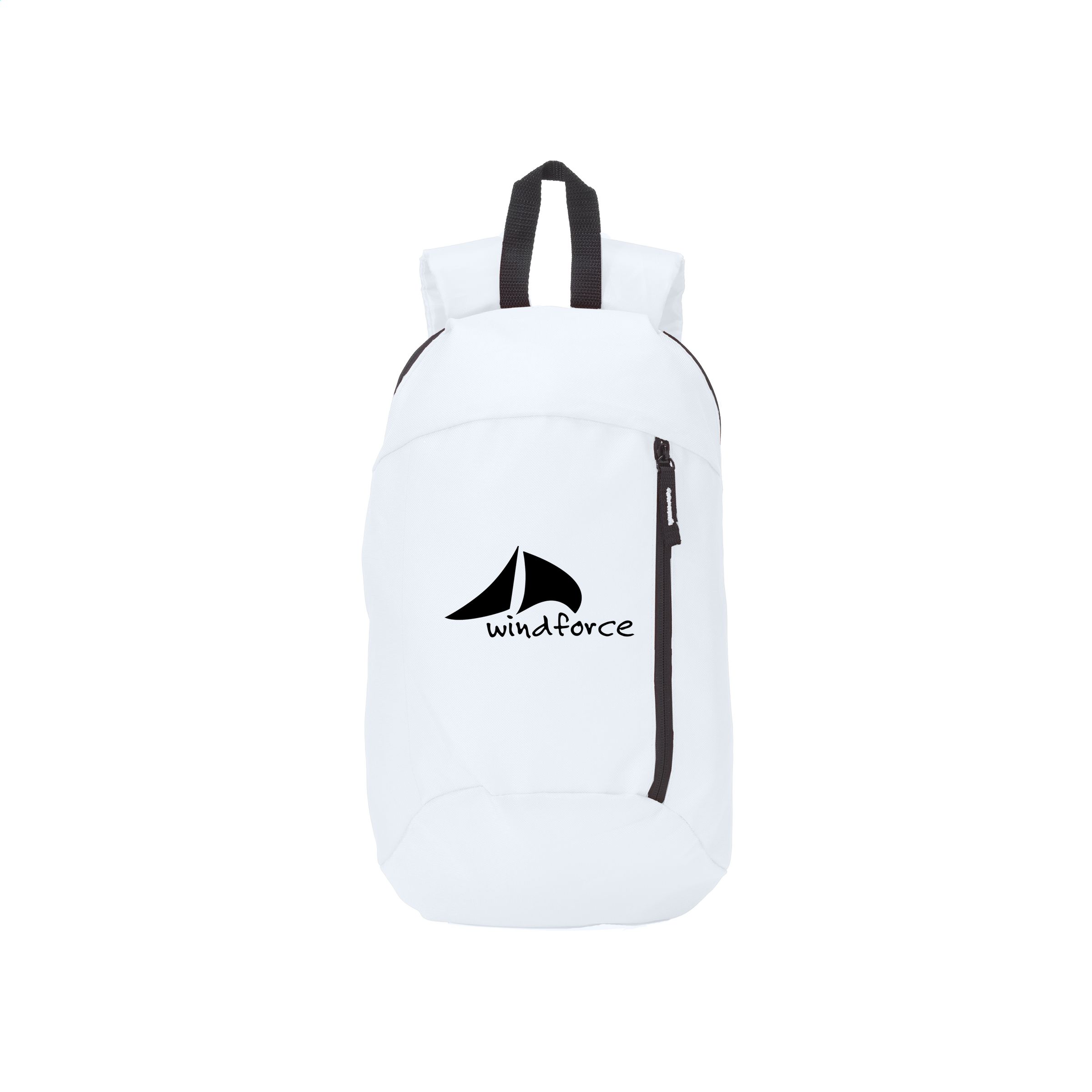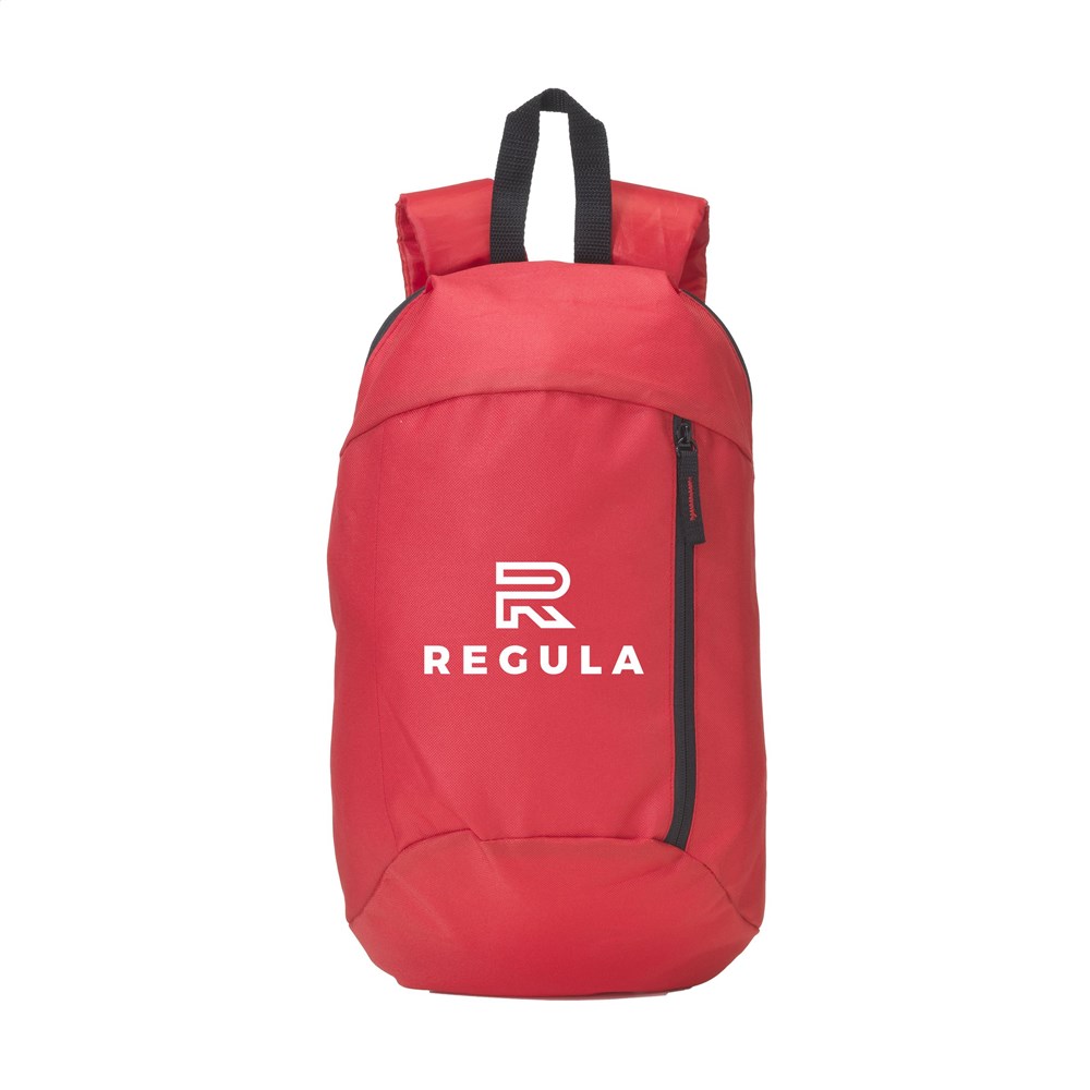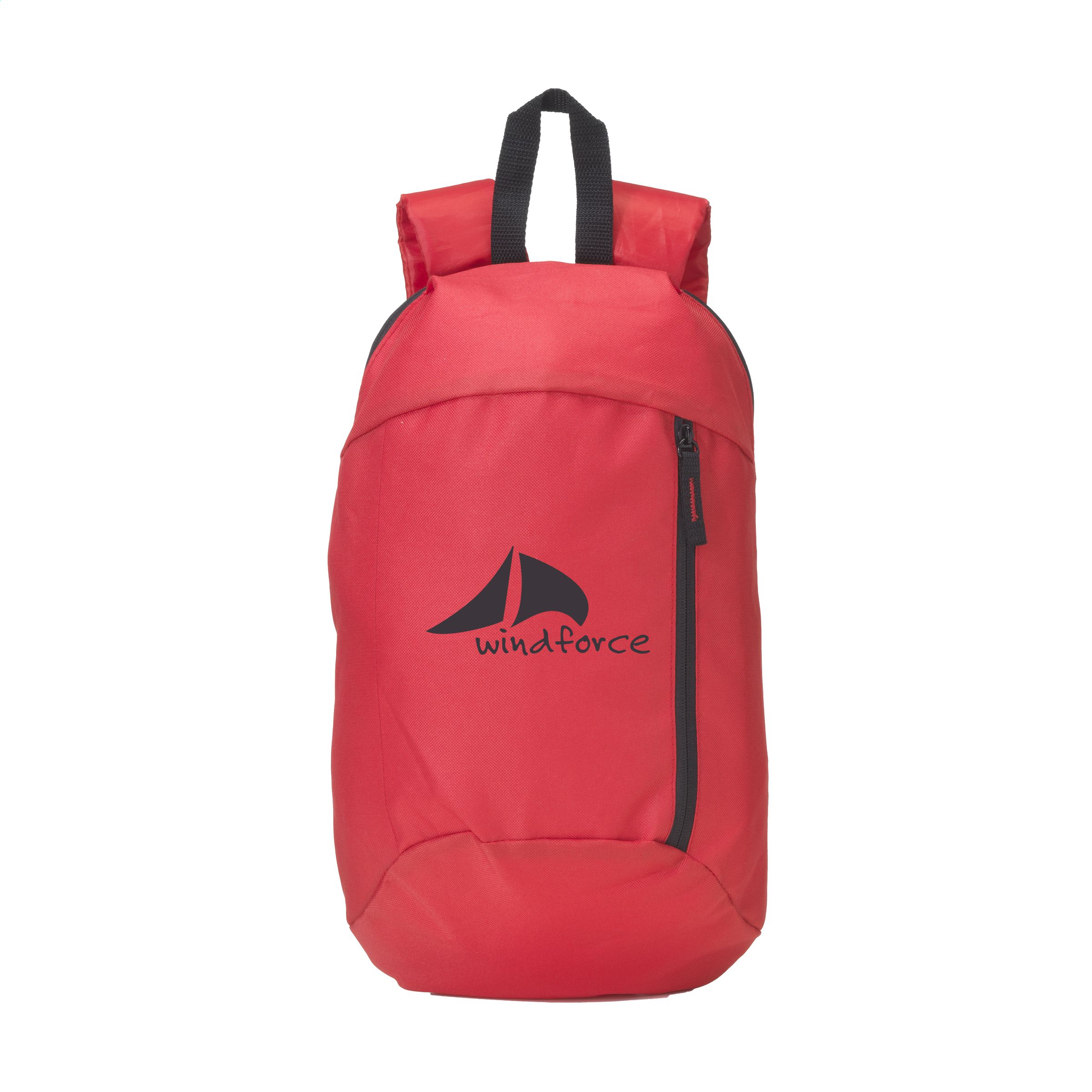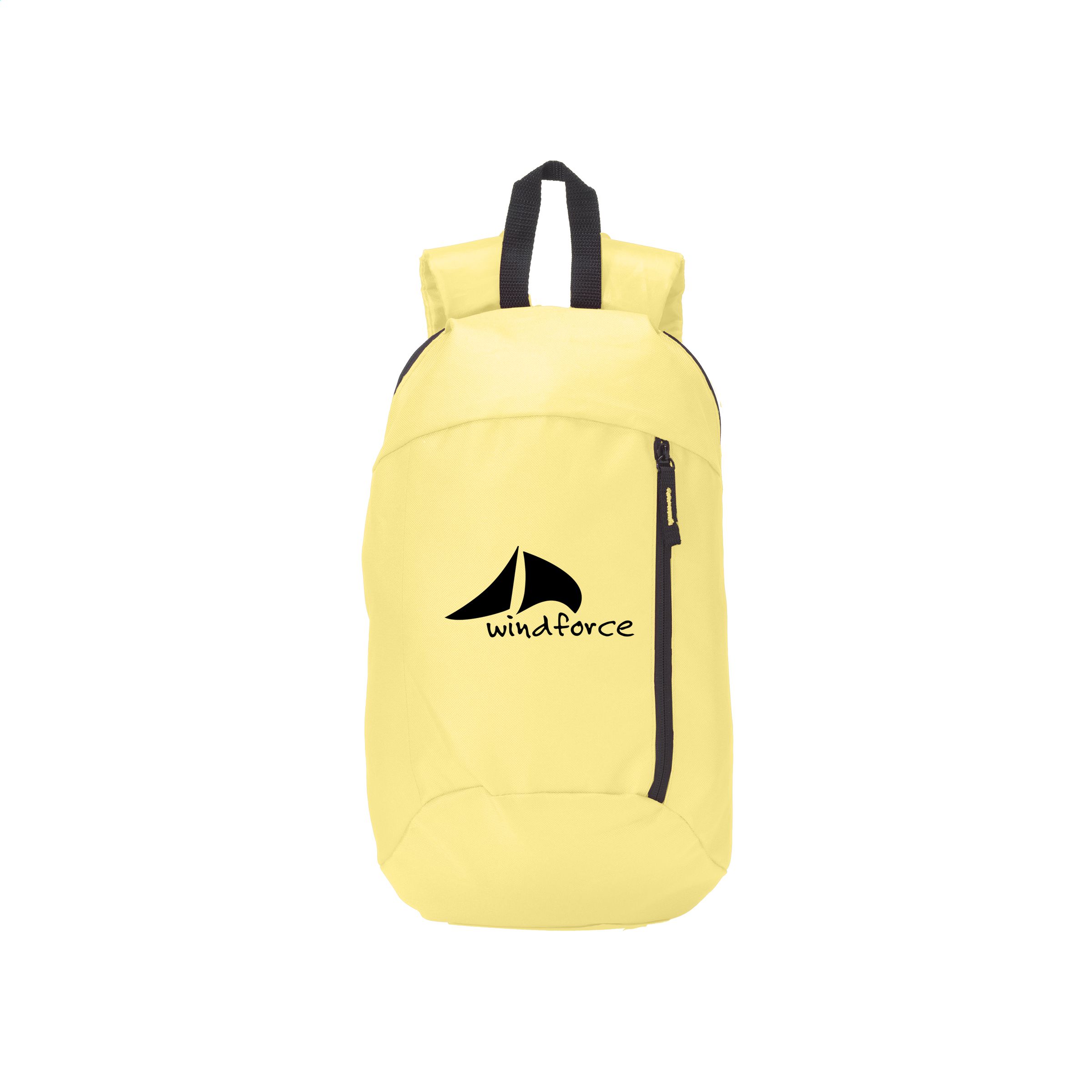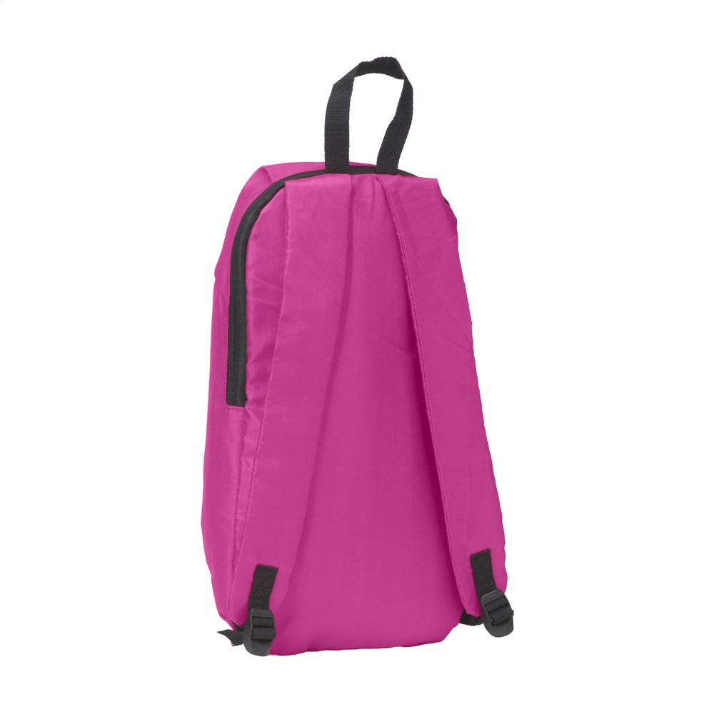 Superlichte, polyester rugzak met ruim hoofdvak, voorvak met rits, gewatteerde rugzijde, verstelbare gewatteerde schouderriemen en draaglus. Inhoud ca. 8 liter.