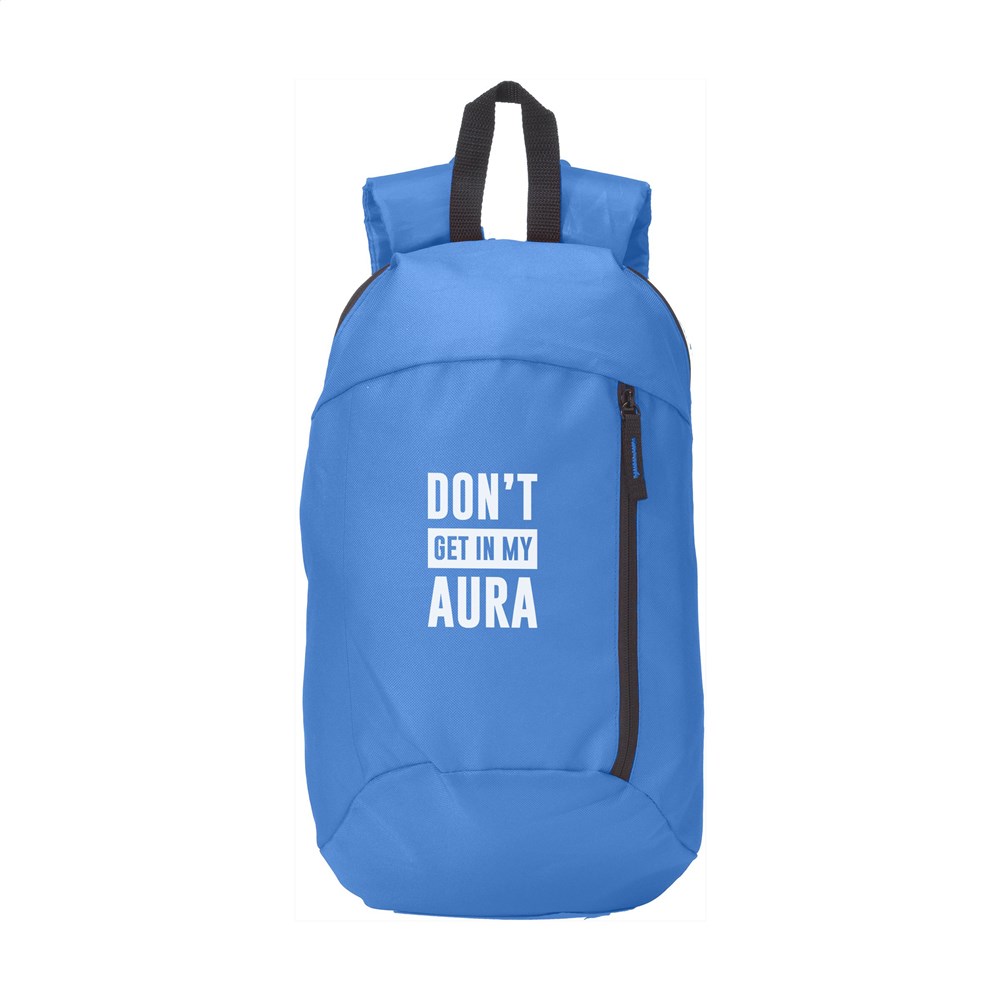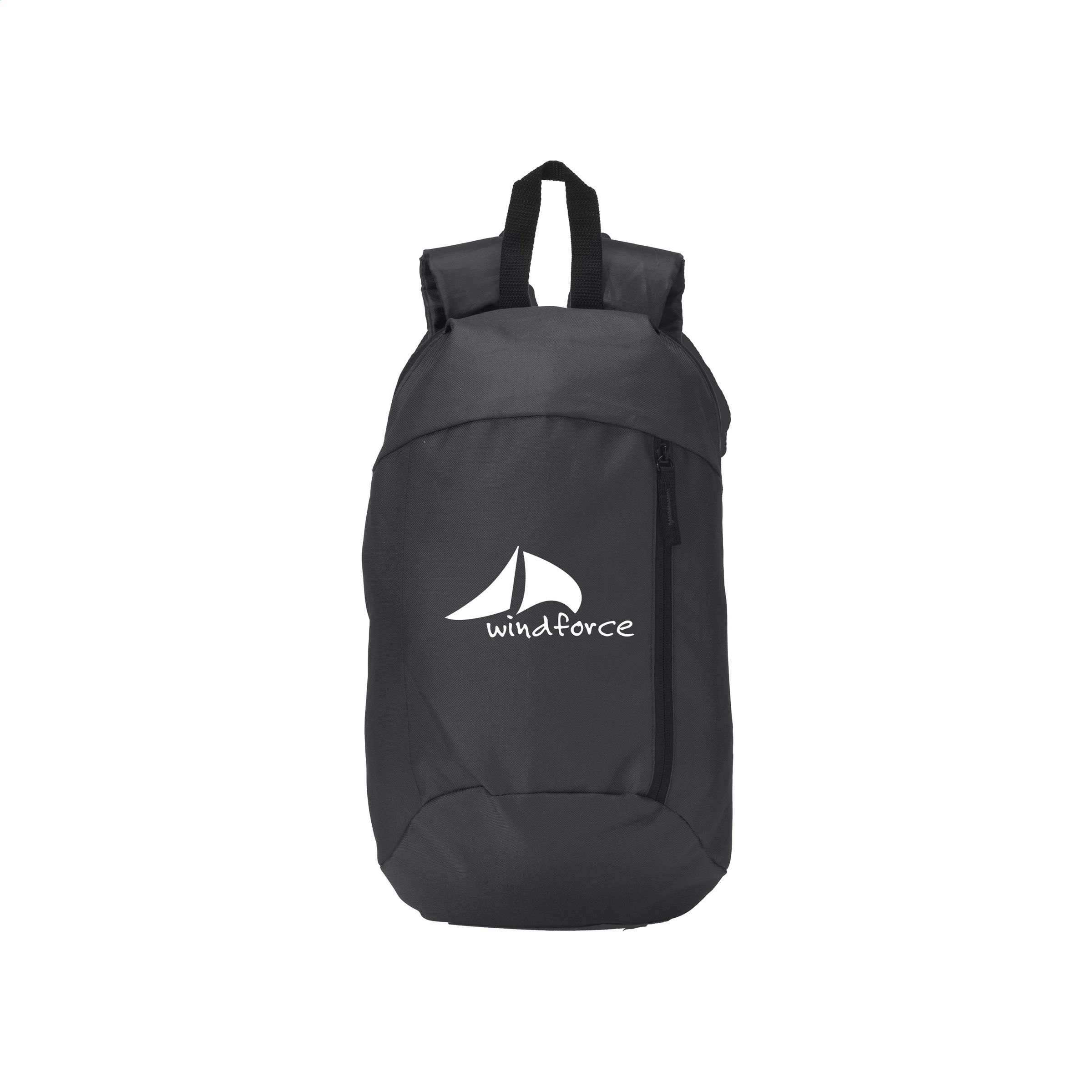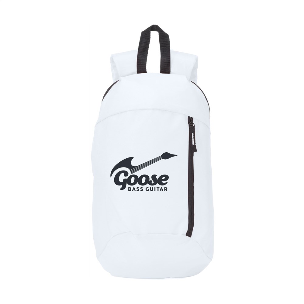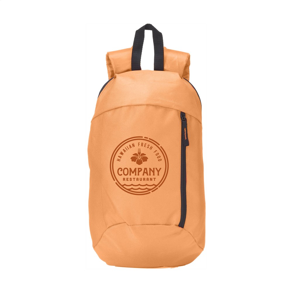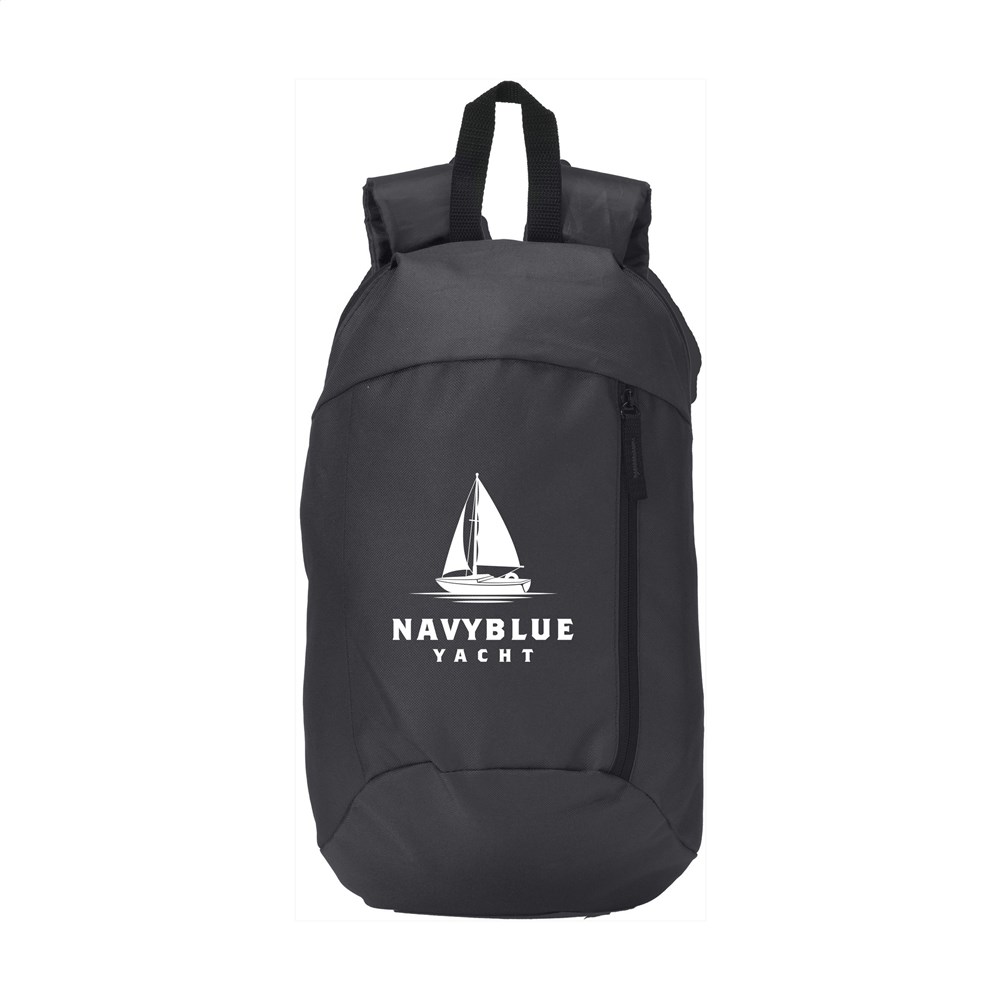 Superlichte, polyester rugzak met ruim hoofdvak, voorvak met rits, gewatteerde rugzijde, verstelbare gewatteerde schouderriemen en draaglus. Inhoud ca. 8 liter.