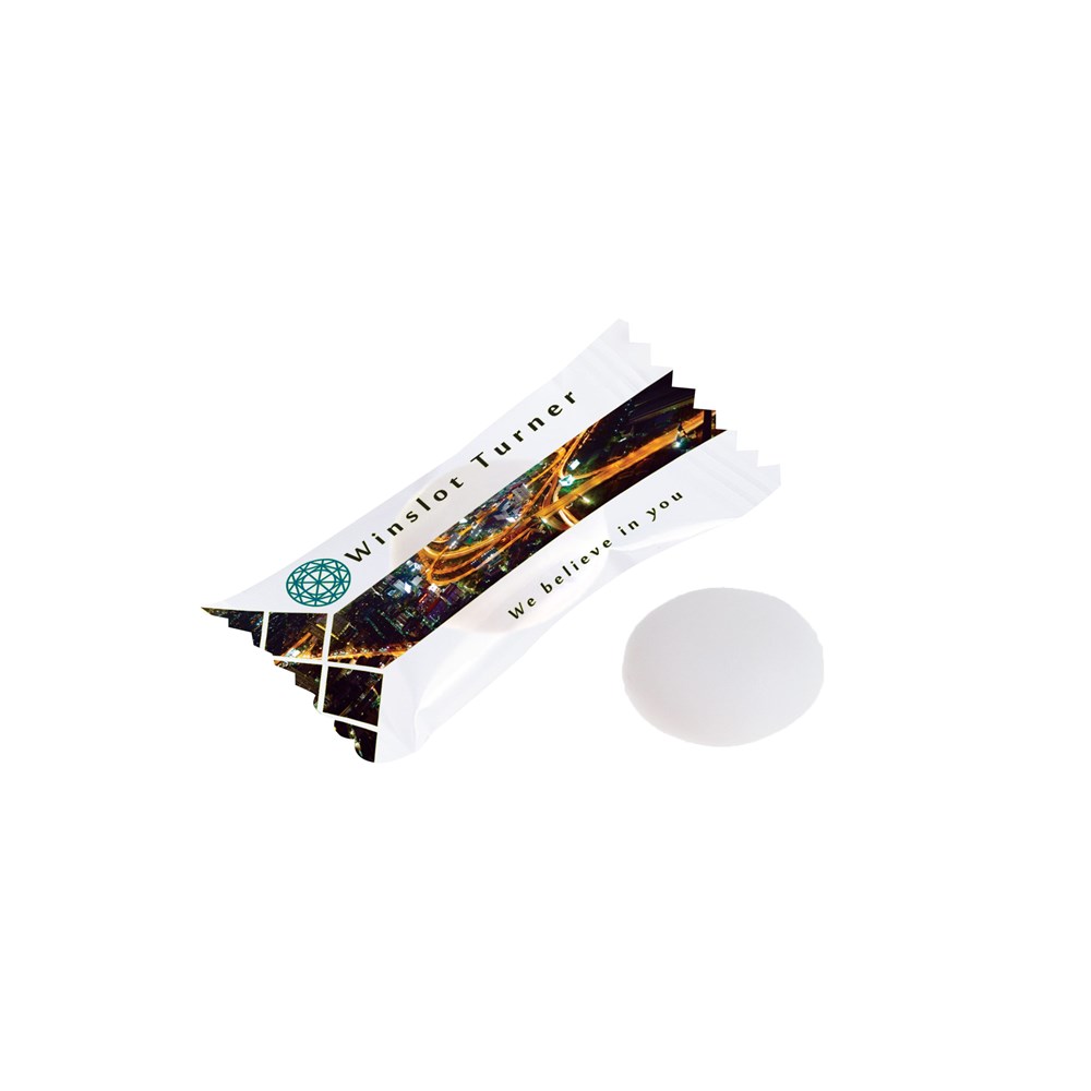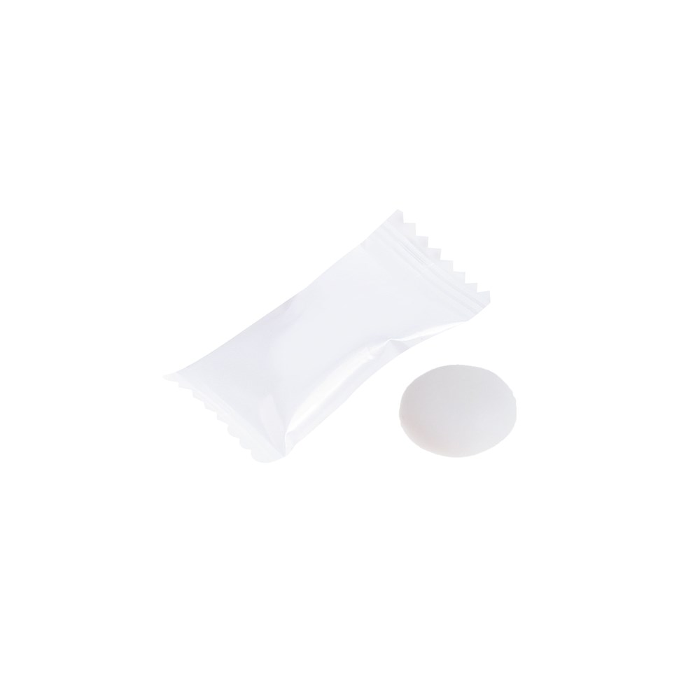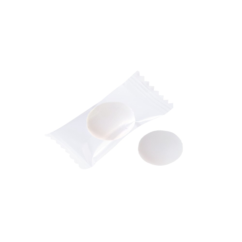 Flowpack wit all-over bedrukt met 1 Mentos mint