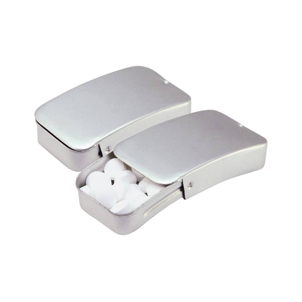 Bedrukt mini slidy blikje zilver met ca. 8 gr. mini pepermuntjes