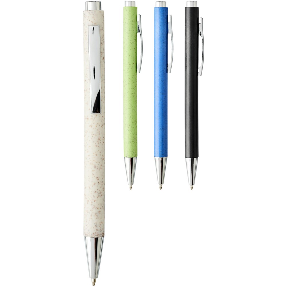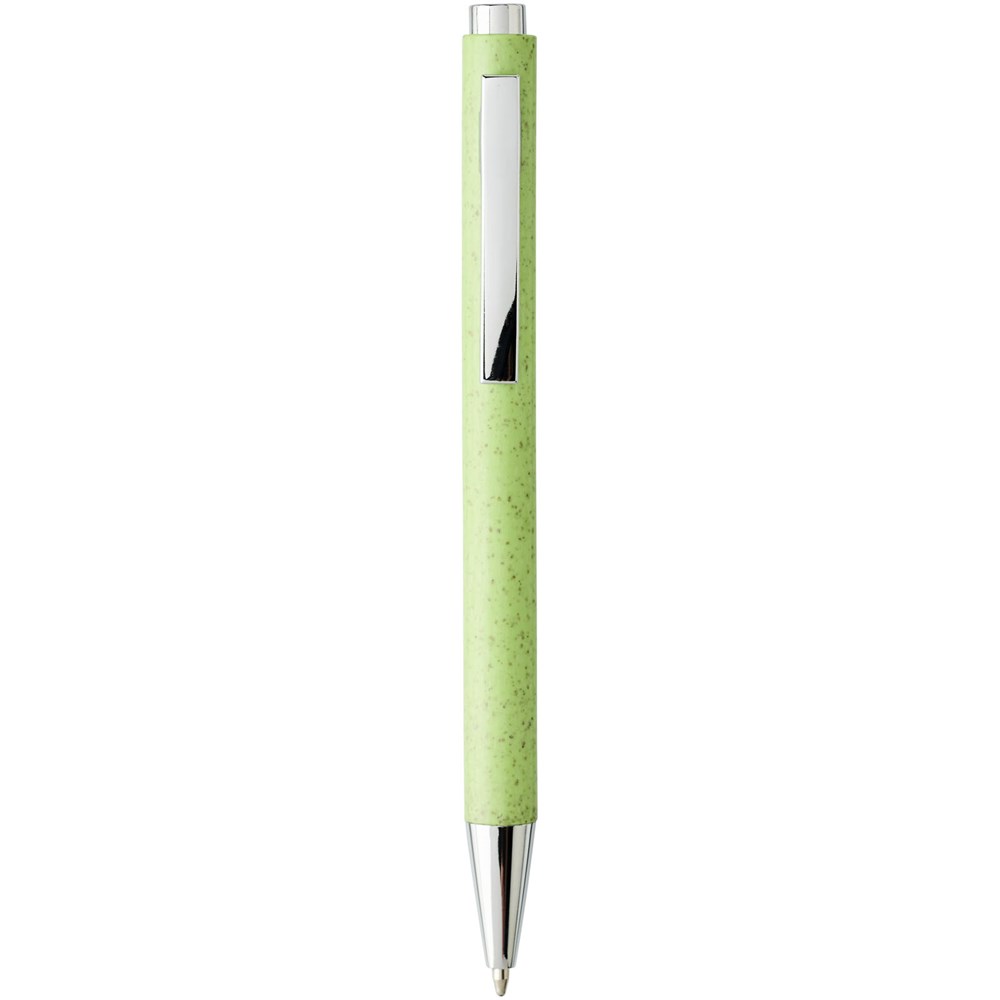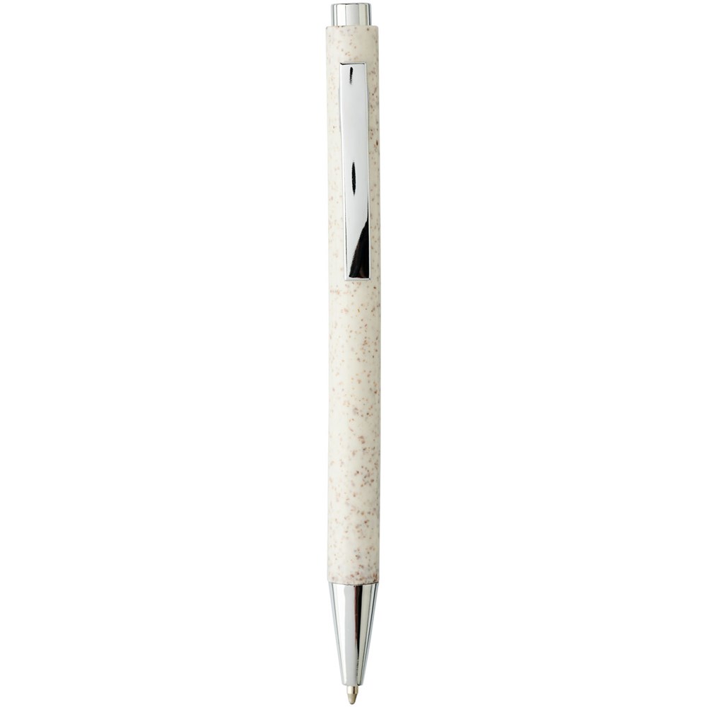 Elegante klassieke balpen met klikmechanisme, met een huls van tarwestro en afgewerkt met opvallende chroomkleurige details. Na het oogsten van de tarwekorrels blijft er tarwestro over, waardoor er minder plastic wordt gebruikt.