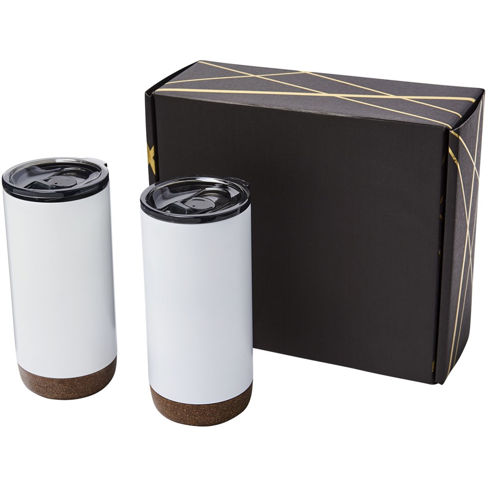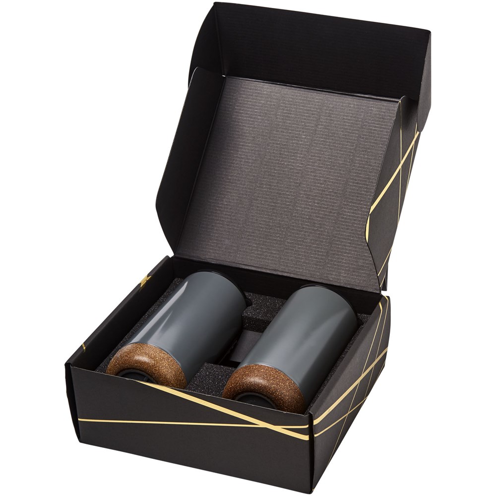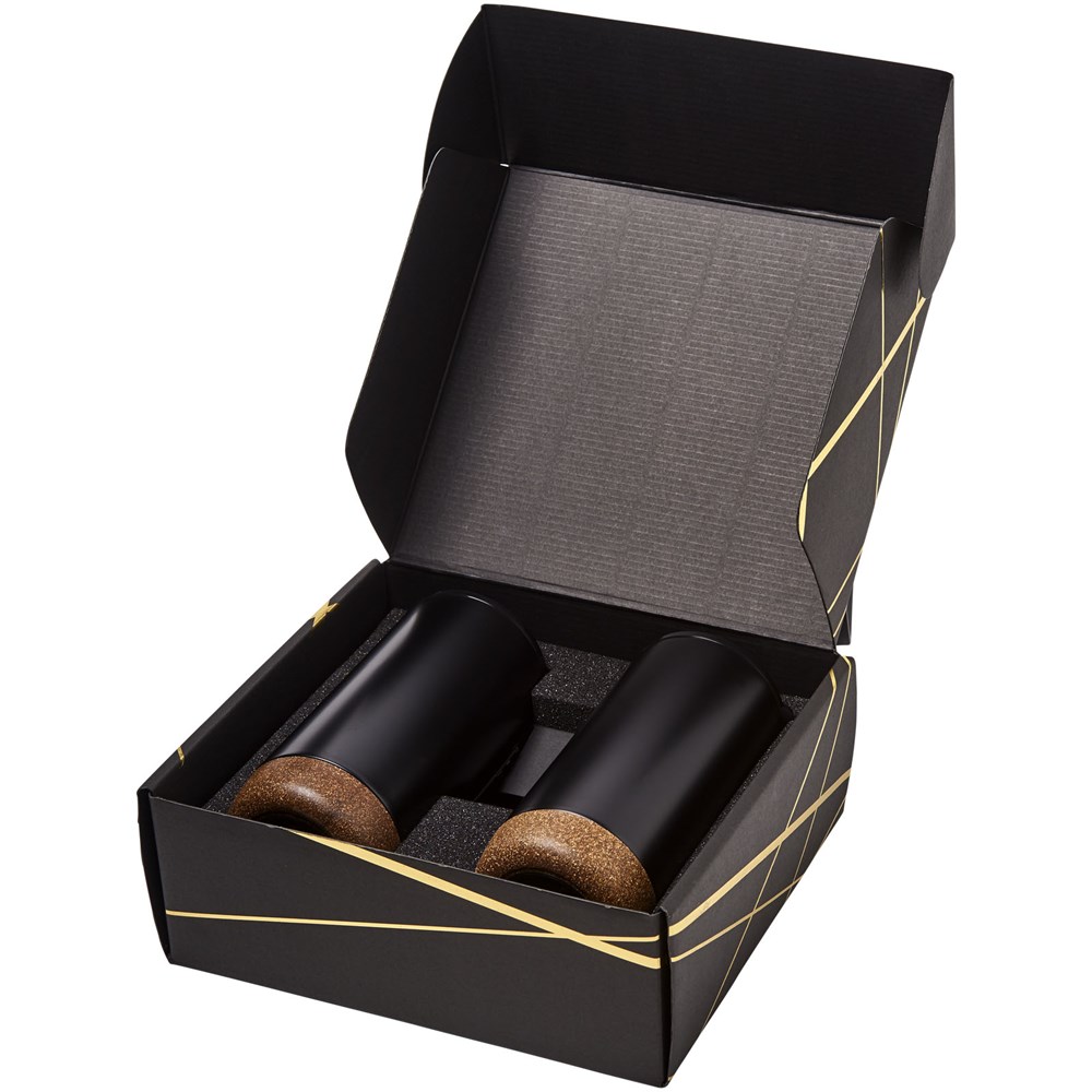 Geschenkset van twee Valhalla 500 ml koper vacuüm geïsoleerde drinkfless. Gepresenteerd in een zwarte geschenkverpakking met glimmende goudkleurige details.