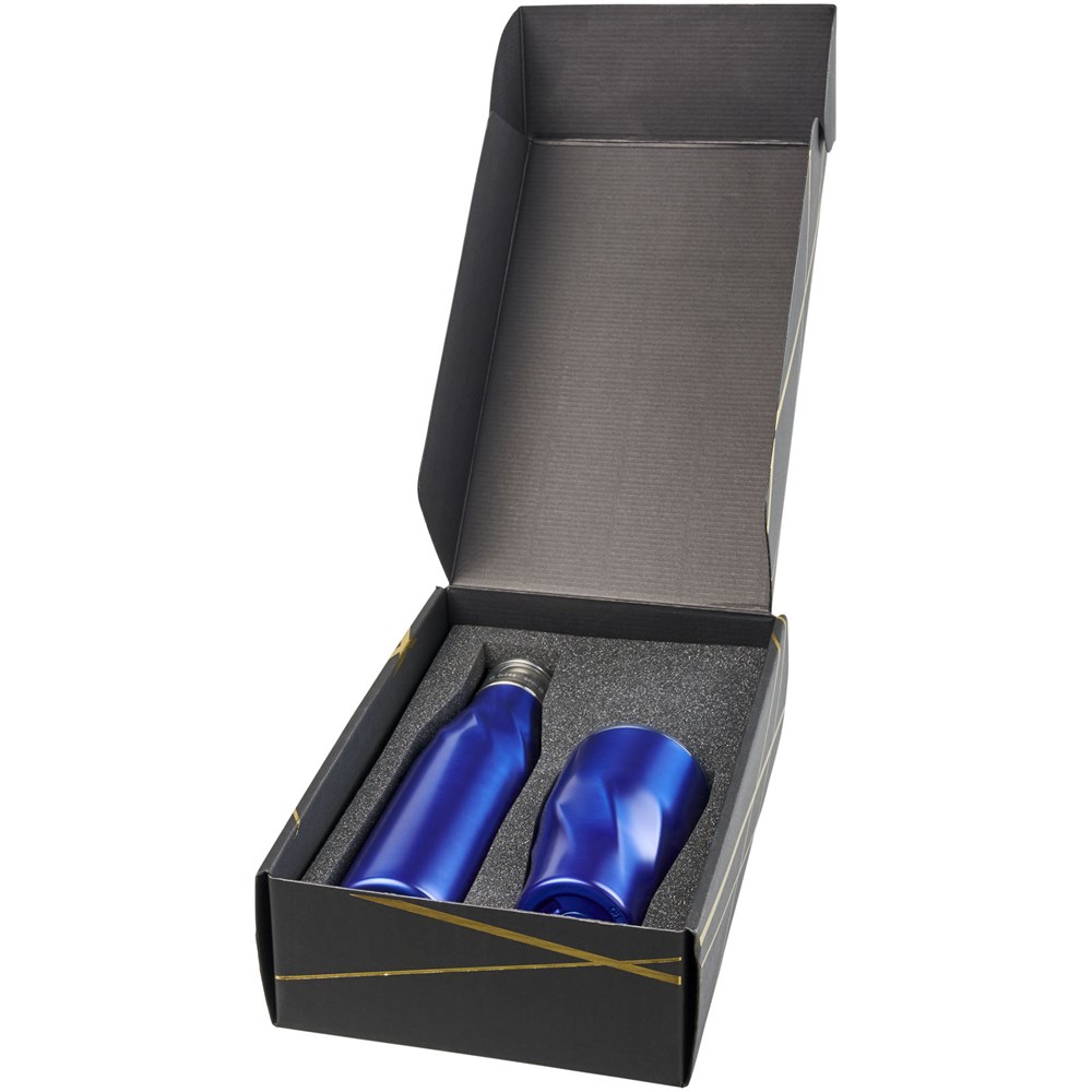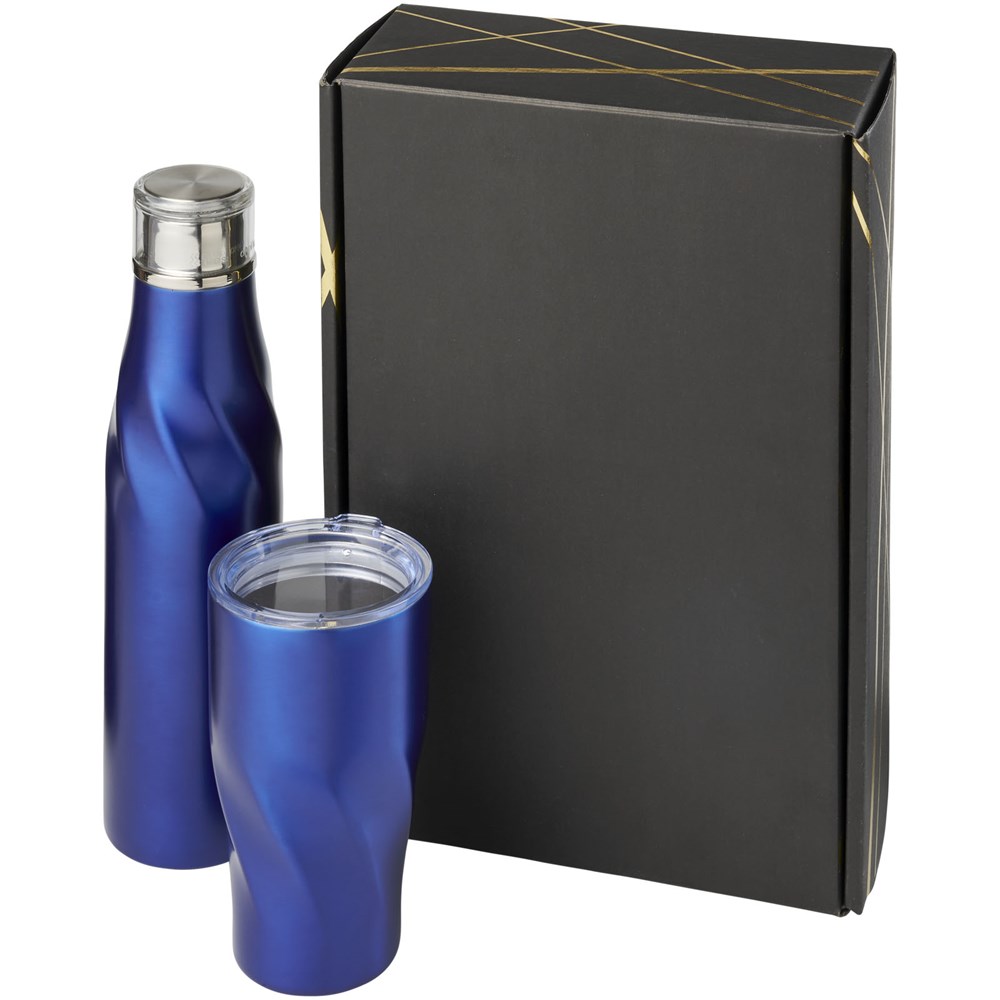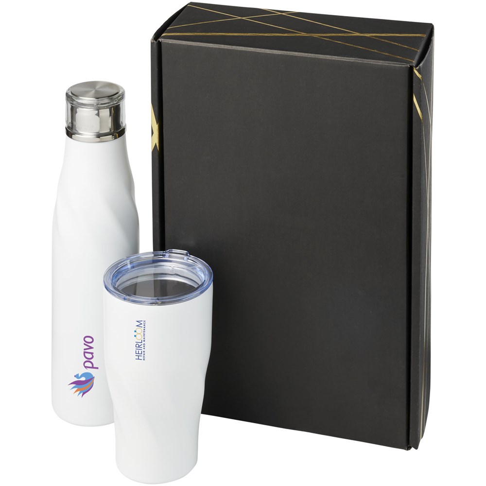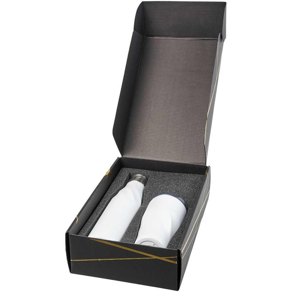 Geschenkset van een Hugo 650 ml koper vacuüm geïsoleerde drinkfles met automatische afdichting met een Hugo 470 ml koper vacuüm geïsoleerde beker. Gepresenteerd in een zwarte geschenkverpakking met glimmende goudkleurige details.