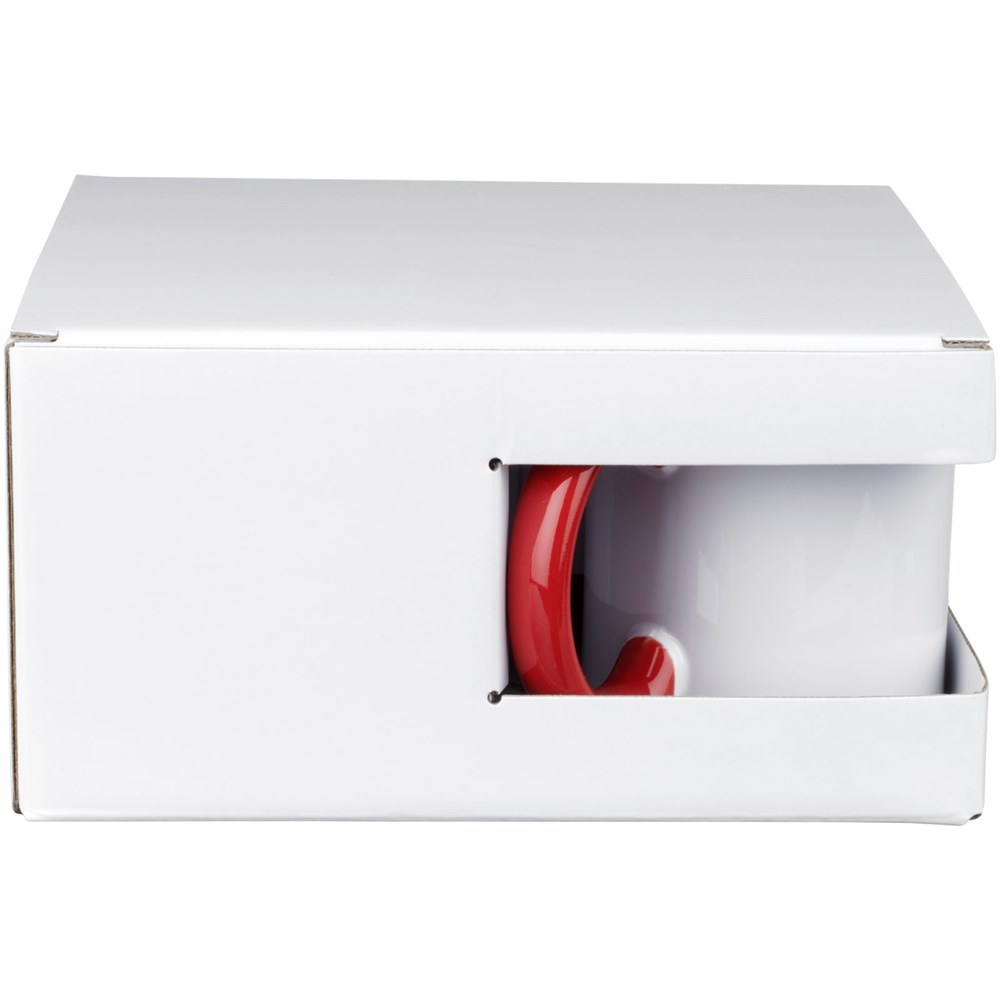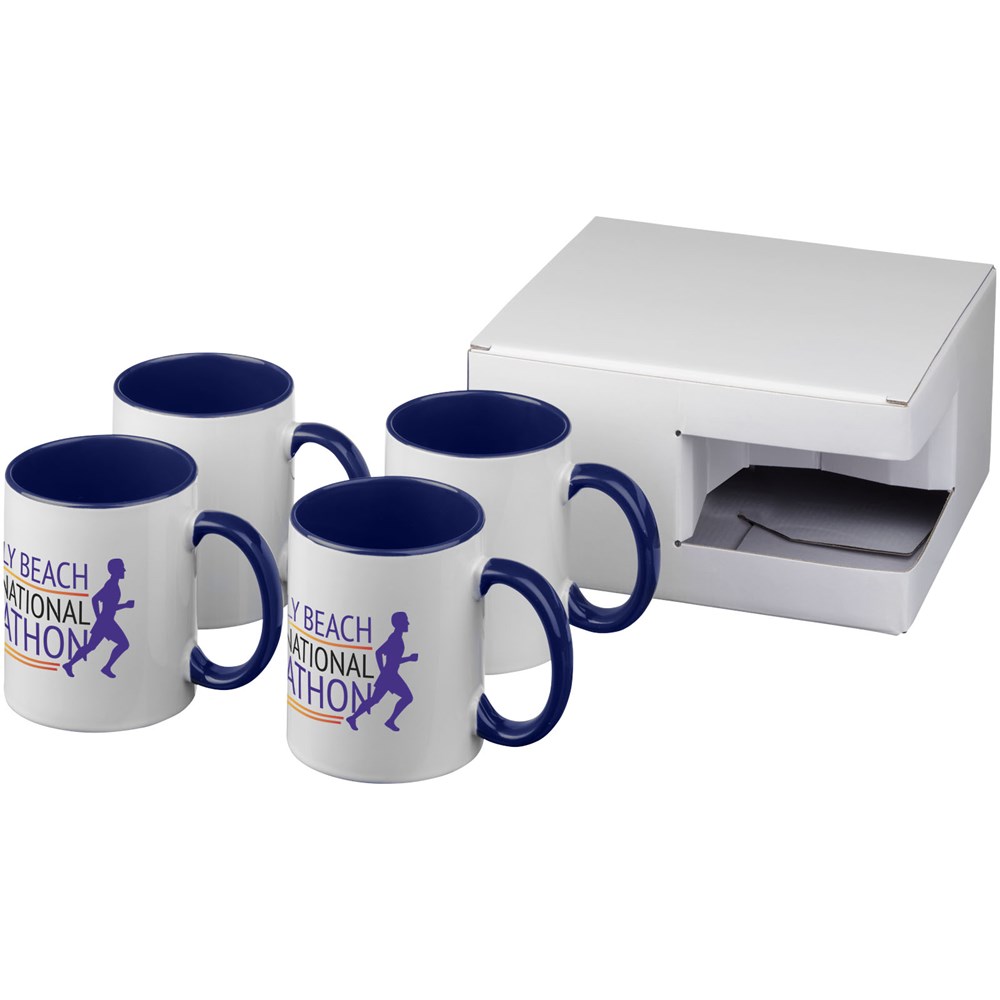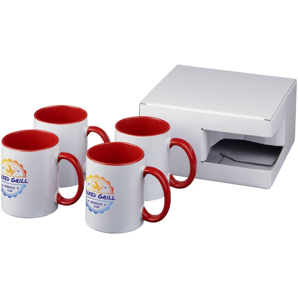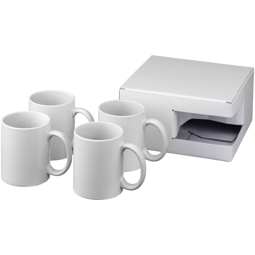 Geschenkset van vier keramische 330 ml mokken. Gepresenteerd in een witte geschenkverpakking met doorkijkvenster.