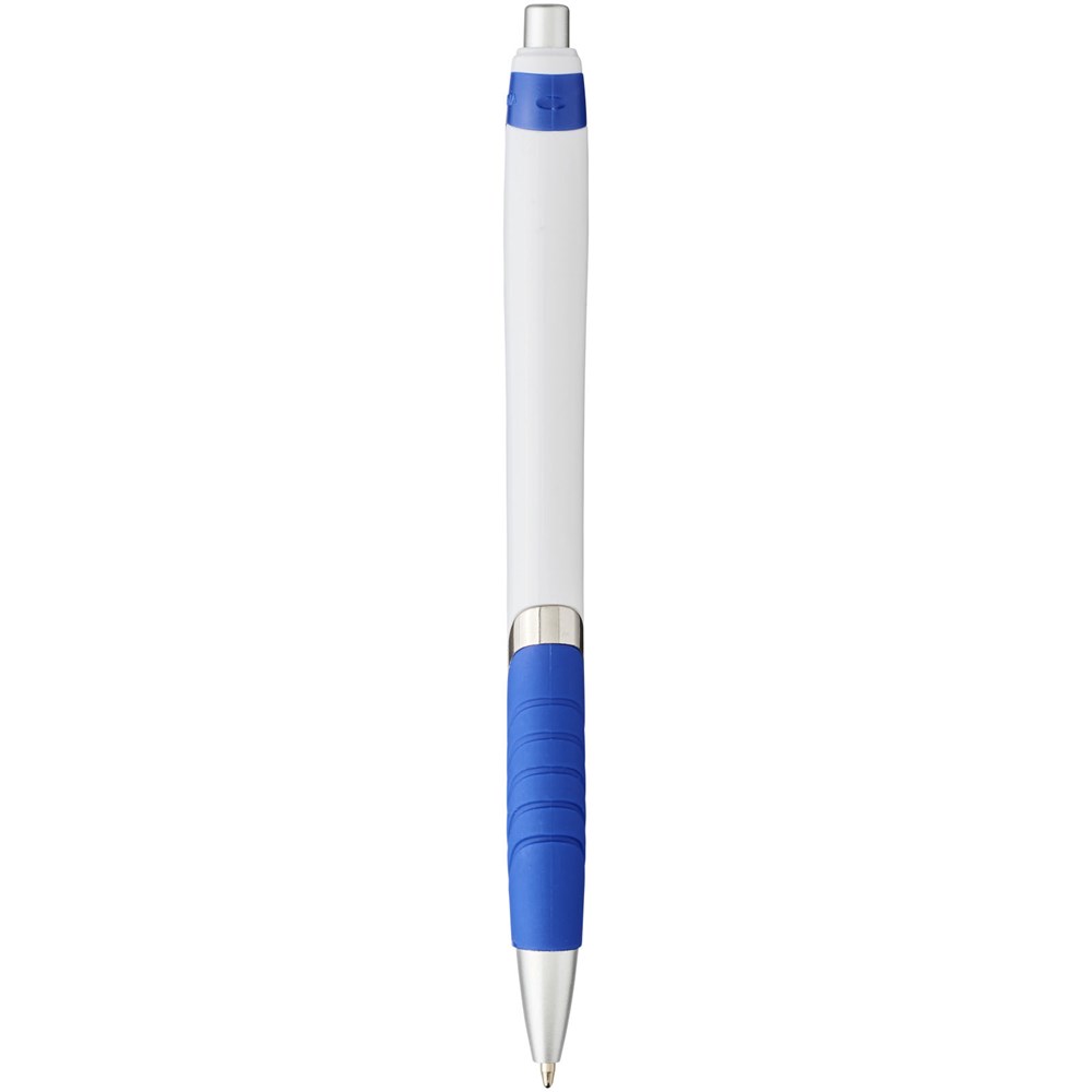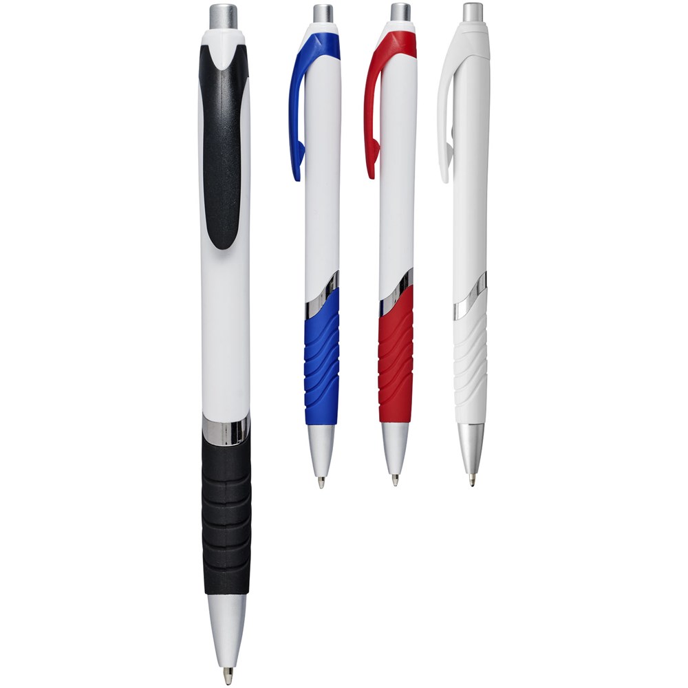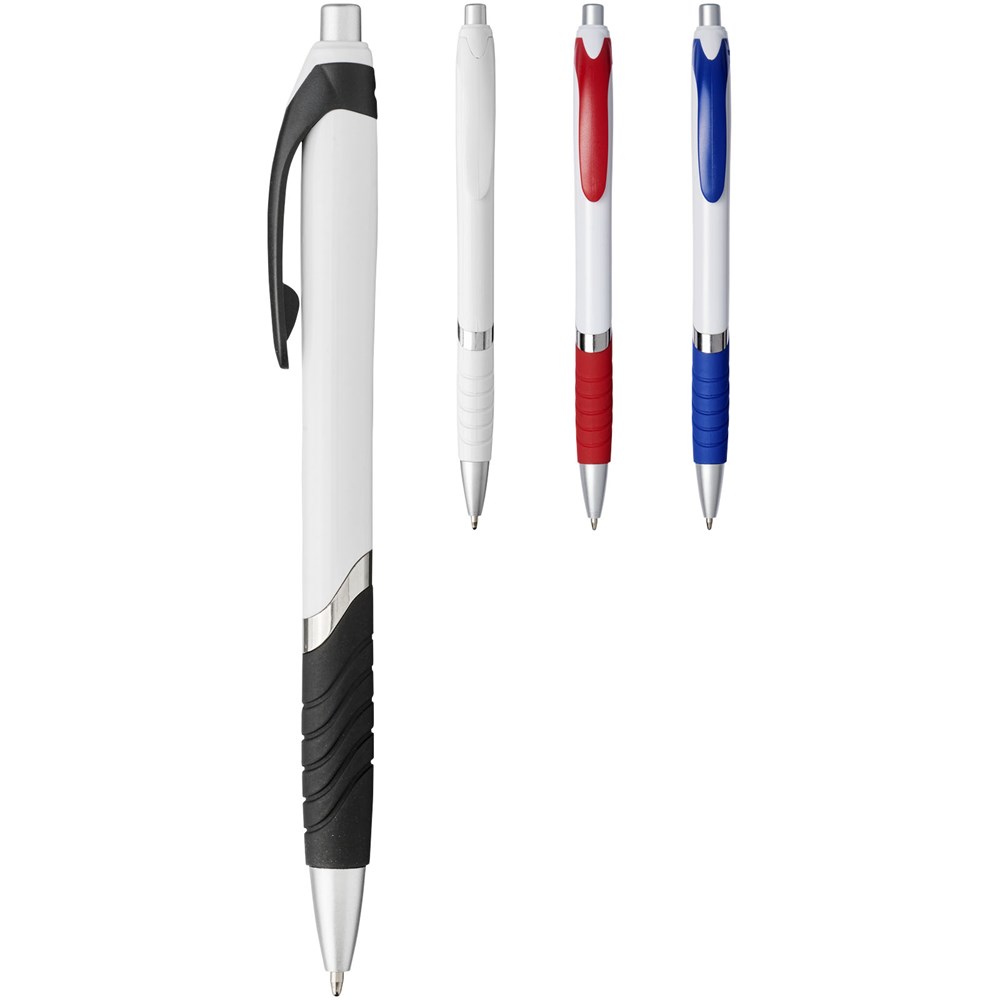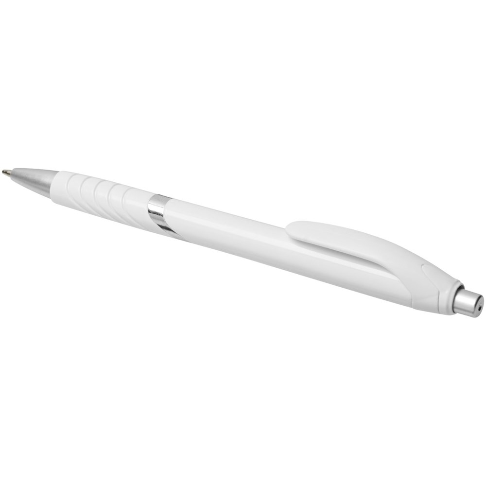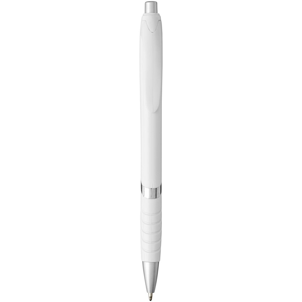 Populaire balpen met klikmechanisme en witte huls, gekleurde clip, rubberen grip en extra zilveren accenten.