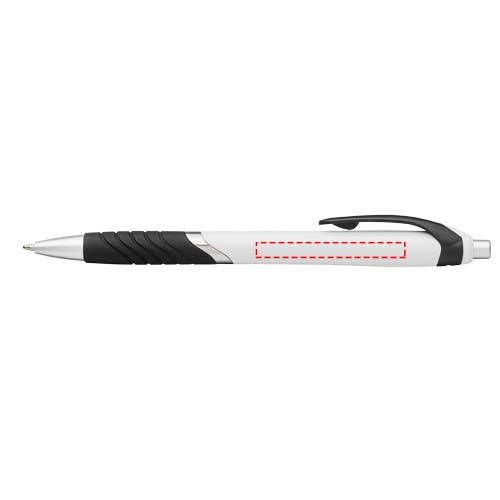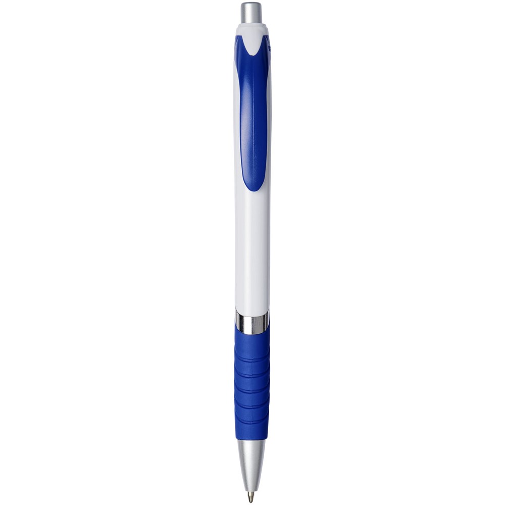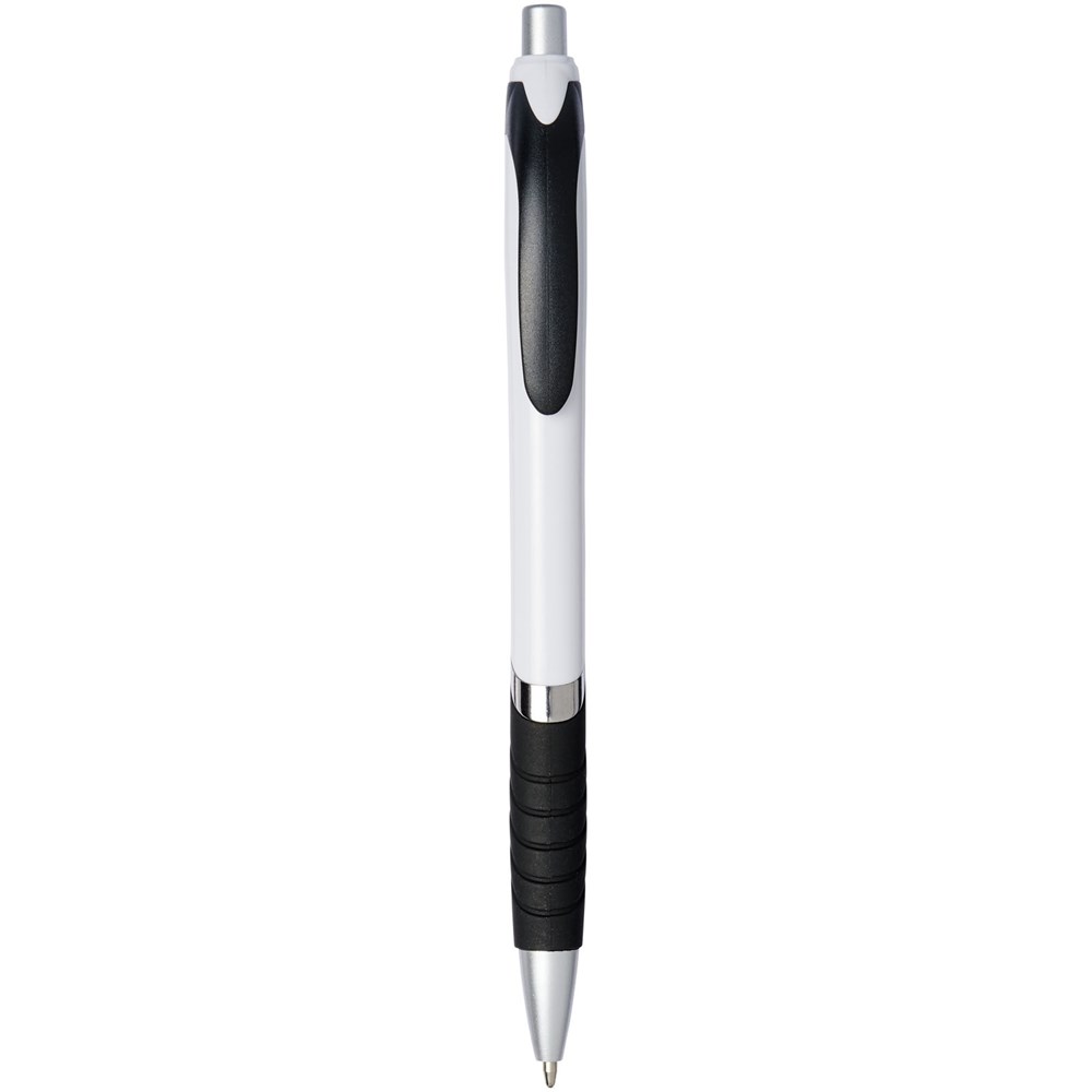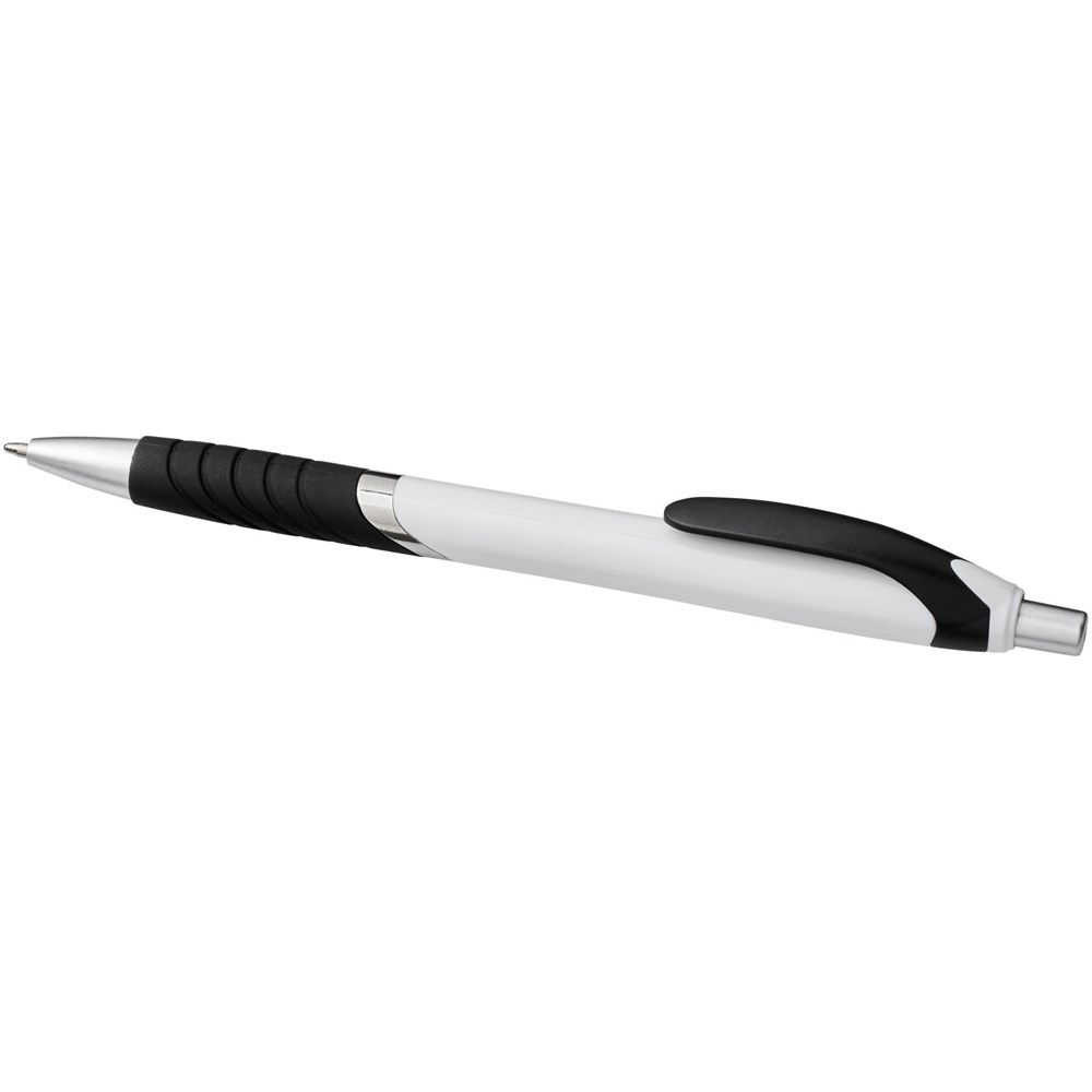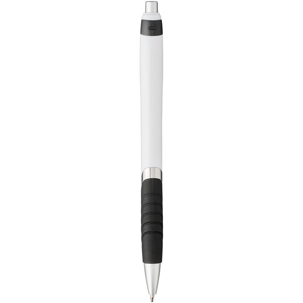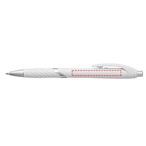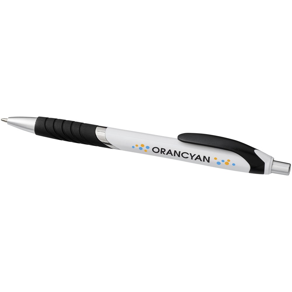 Populaire balpen met klikmechanisme en witte huls, gekleurde clip, rubberen grip en extra zilveren accenten.