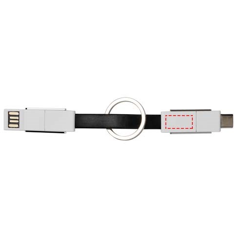 Eén 4-in-1 kabel die alle oplaadbehoeften in één pakket bevat. Het bevat een USB type-A, type-C en een 2-in-1 uiteinde dat compatibel is met zowel iOS- als Android-apparaten. Het kan worden gebruikt voor opladen en gegevensuitwisseling. Wordt geleverd met een sleutelhanger en heeft magneten om gemakkelijk te kunnen dragen.