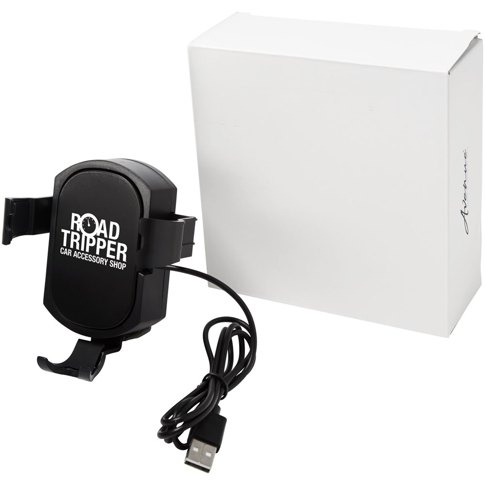 De Prim afneembare draadloze telefoonhouder bevat een afneembaar draadloos laadpad dat kan worden aangesloten op het ventilatiegat van een auto. De micro-oplaadkabel wordt verbonden via een USB-poort om vermogen te leveren, en zodra de telefoon op zijn plaats wordt geklemd, begint het opladen automatisch.