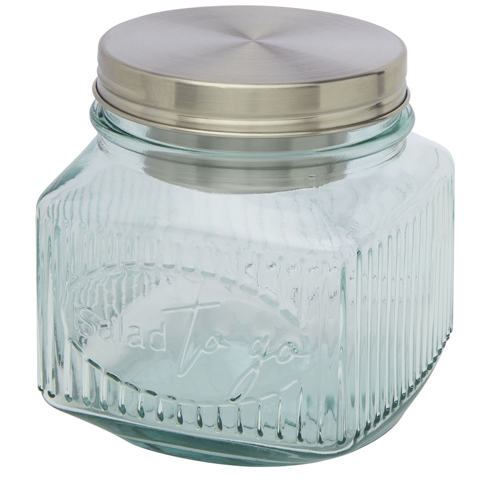 Saladepot van 100% gerecycled glas met een inhoud van 800 ml, perfect voor het bewaren of meenemen van grote porties salade. Onder de roestvrijstalen schroefdop zit een klein inzetstuk voor dressings, sauzen of yoghurt. Zo blijft de salade knapperig en vers in de glazen pot! Geniet altijd en overal van uw maaltijden met deze praktische 'Salad-to-go' pot met schroefdop, gemaakt van gerecyclede glazen flessen. Gerecycled glas wordt geproduceerd met minder energie, grondstoffen en toevoegingen, dan wat nodig is voor het maken van traditioneel glas. Vaatwasserbestendig.