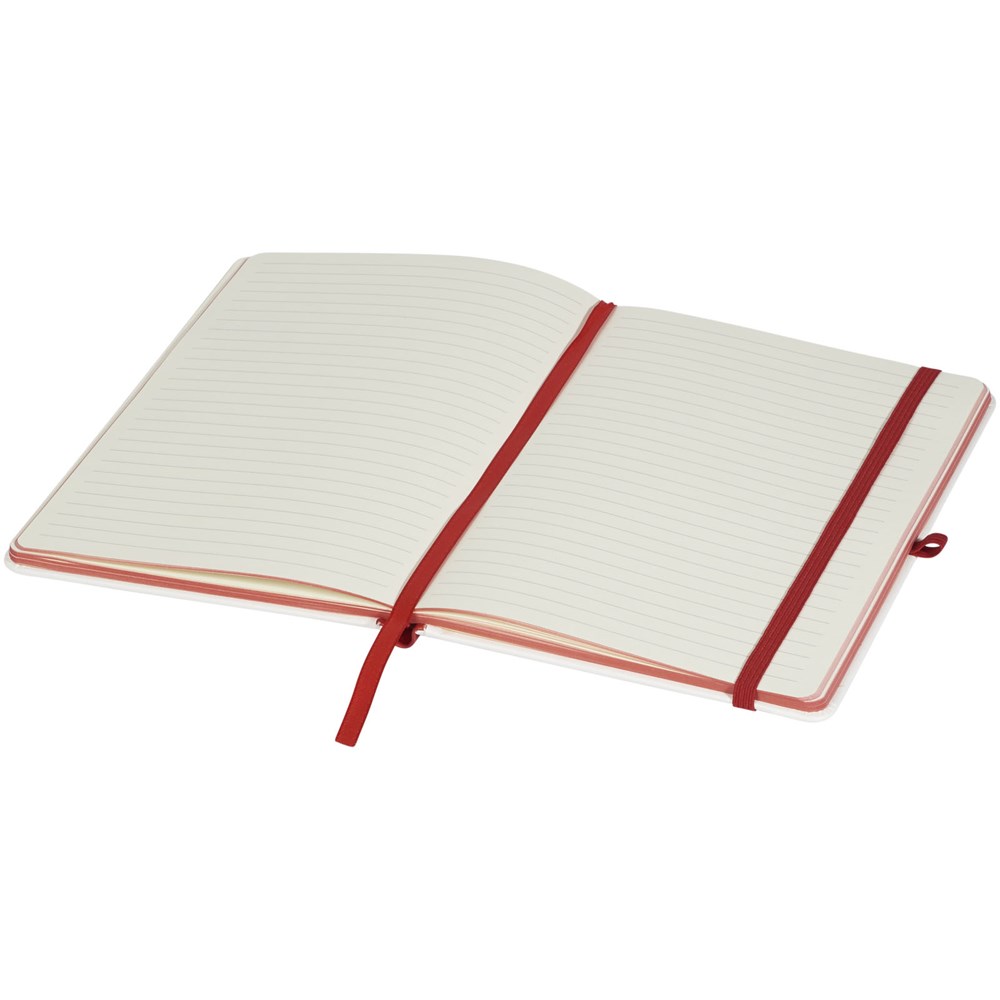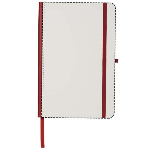 Wit hardcover A5 notitieboek met PU coating en een gekleurde rug. Ideaal voor volledig dekkend digitaal afdrukken. Met elastische sluiting in bijpassende kleur, lint als bladwijzer en elastische penlusje. 80 g/m2, 80 vellen crèmekleurig lijntjespapier.