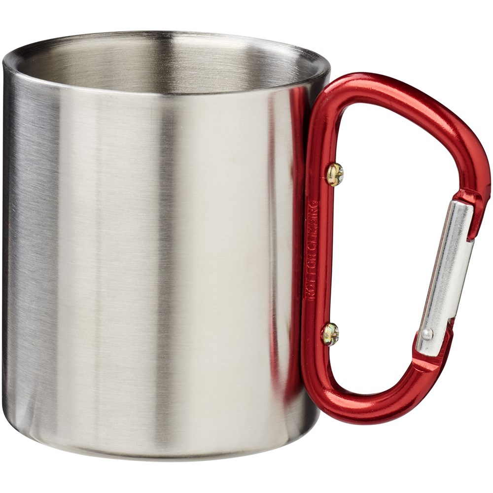 Alps geïsoleerde drinkbeker met karabijnhaak. Geïsoleerde beker van roestvrij staal met groot handvat in de vorm van een karabijnhaak. Ideaal voor kampeerders en outdoor liefhebbers. Inhoud 200 ml. RVS binnen- en buitenzijde.