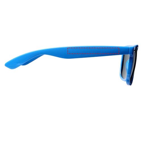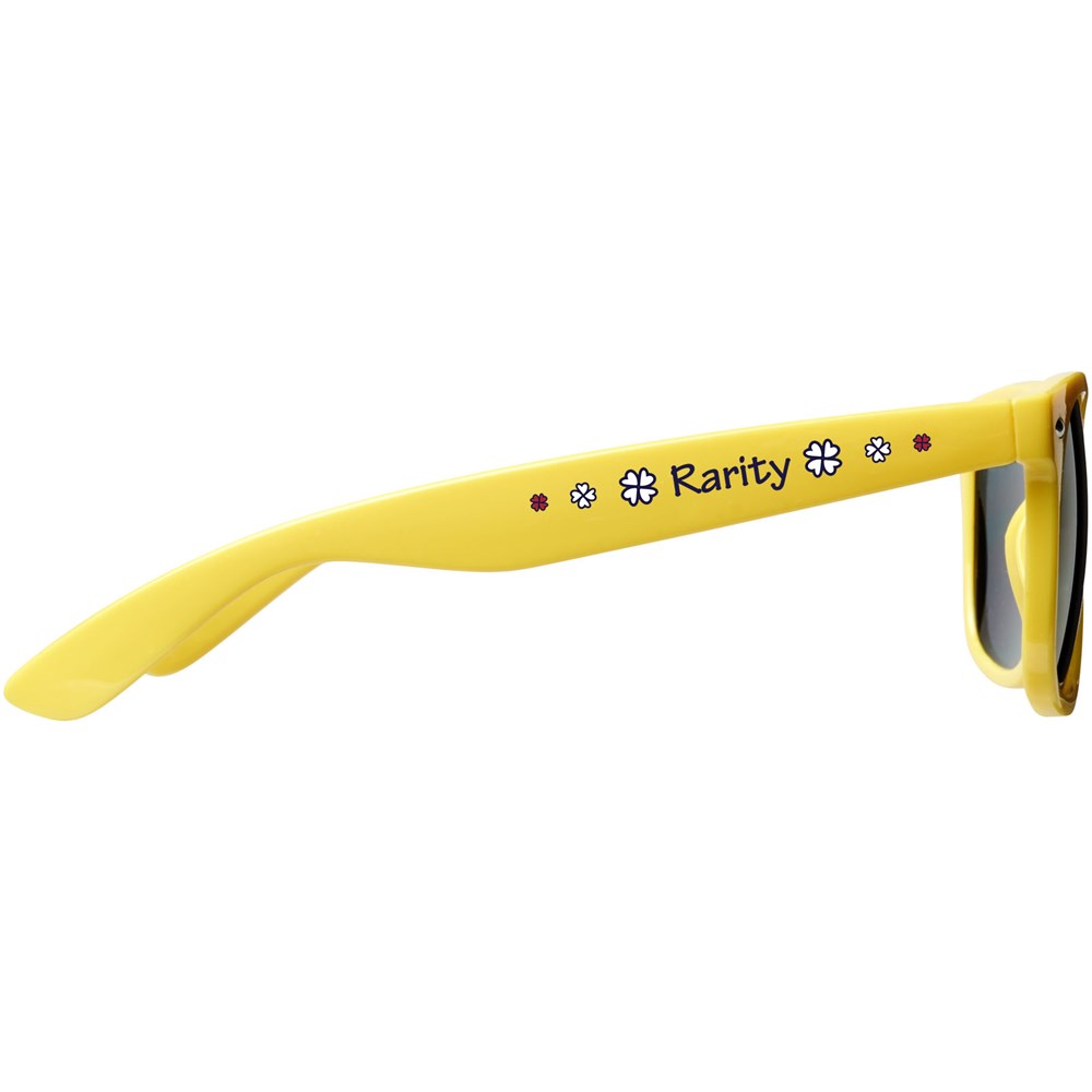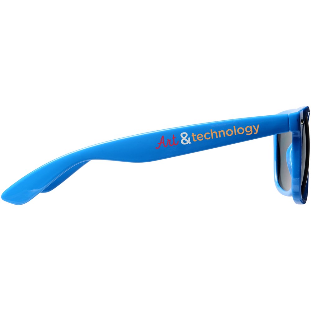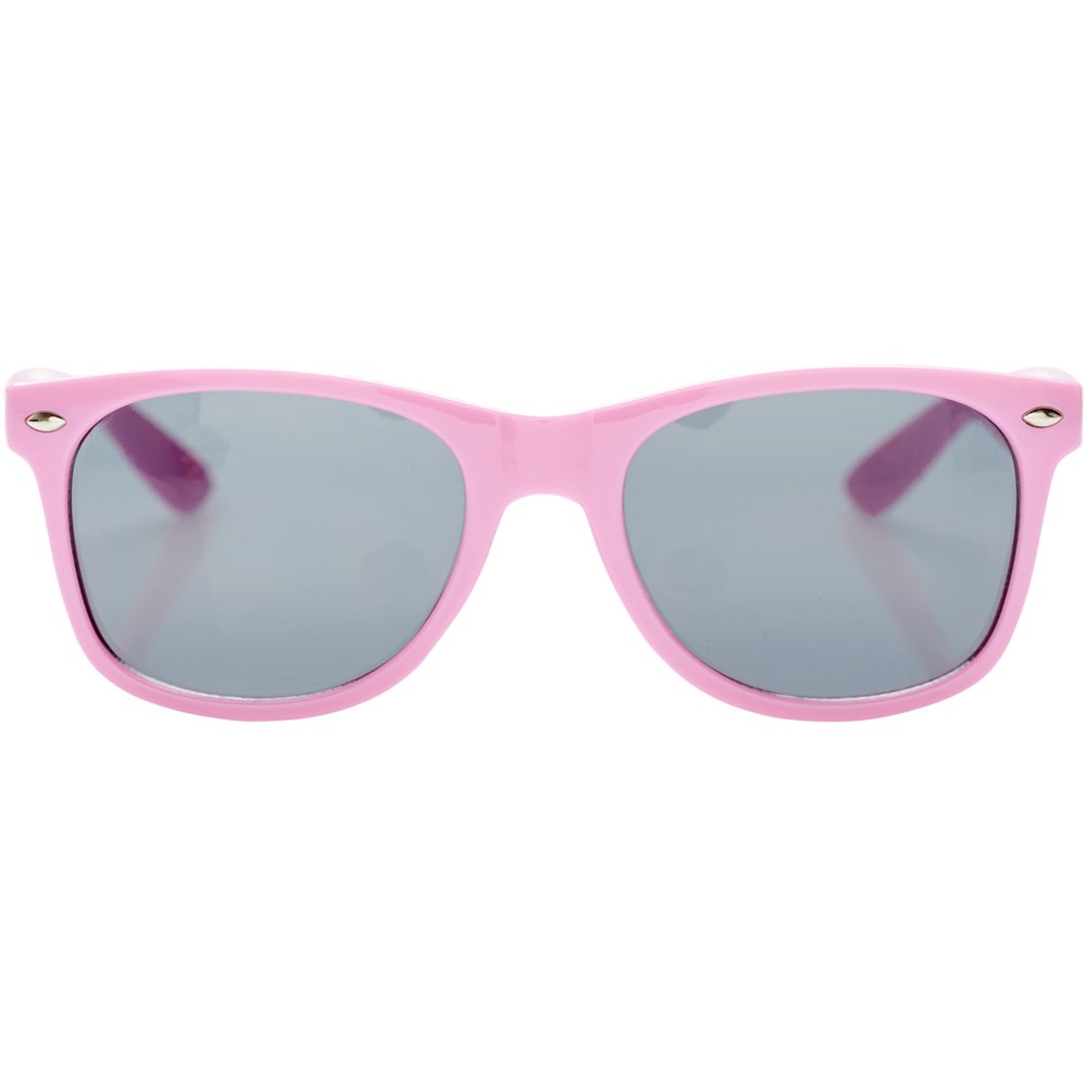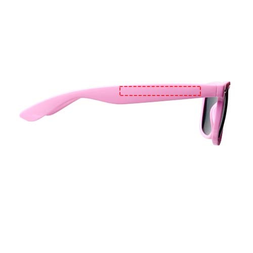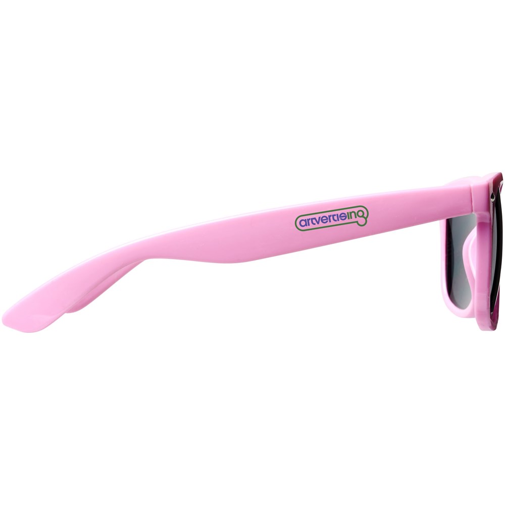 Sun Ray retro zonnebril in frisse kleuren voor kinderen. Aanbevolen leeftijd van 3 tot 12 jaar. Voldoet aan EN ISO 12312-1 en UV-400, glazen zijn van klasse 3. Standaard komt de bedrukking op 1 pootje