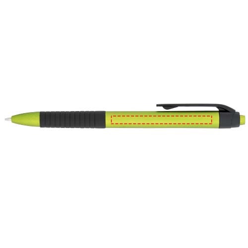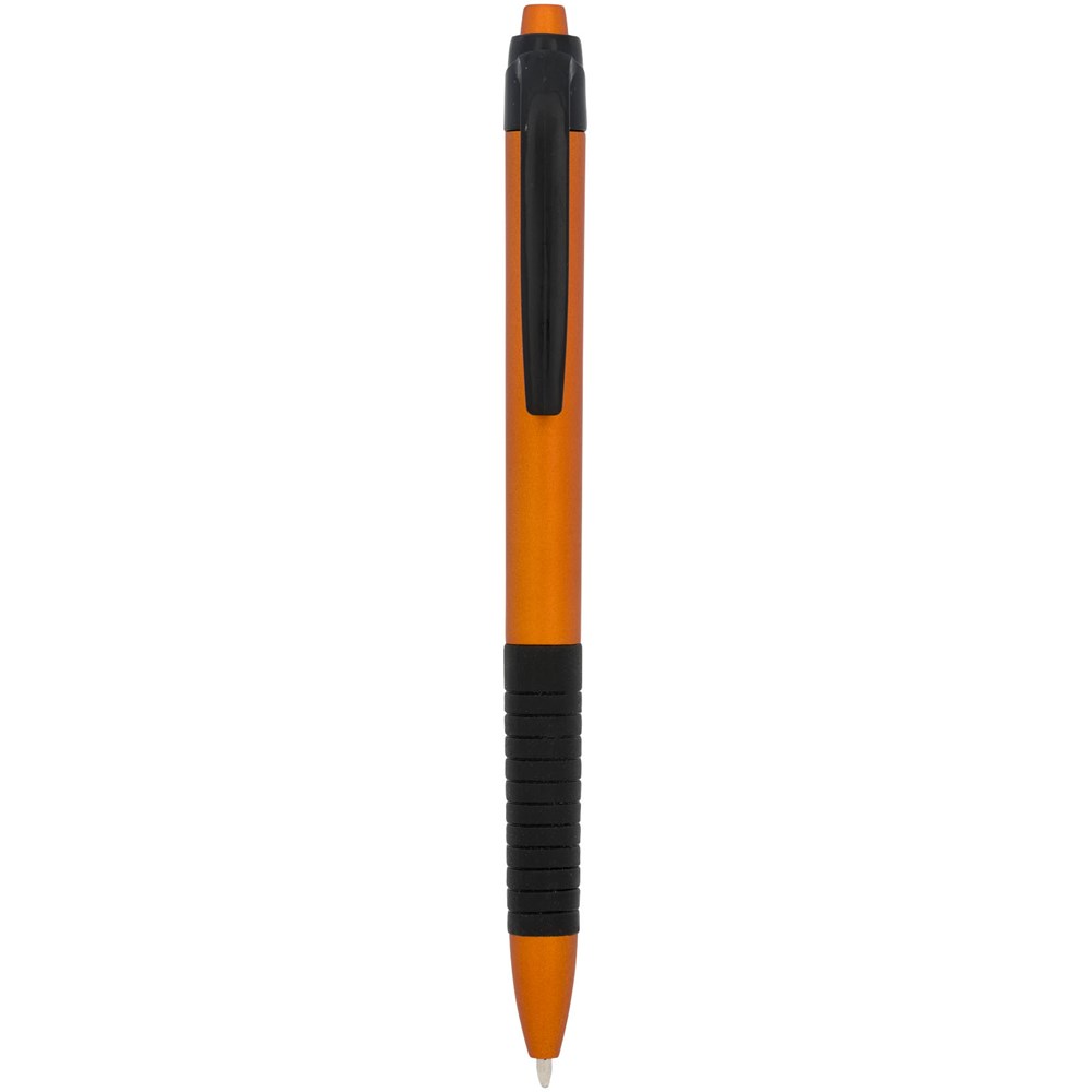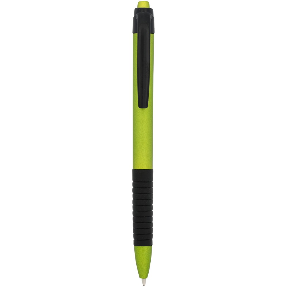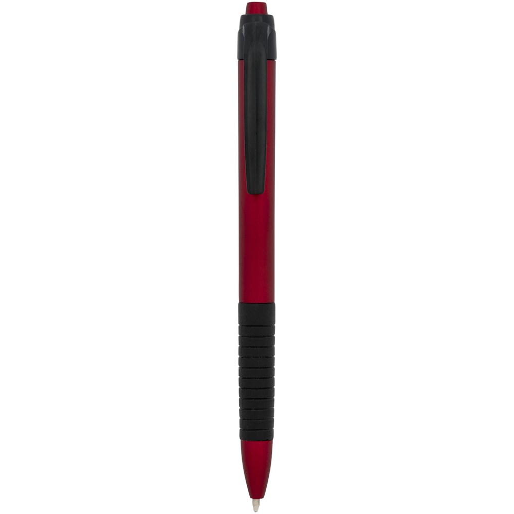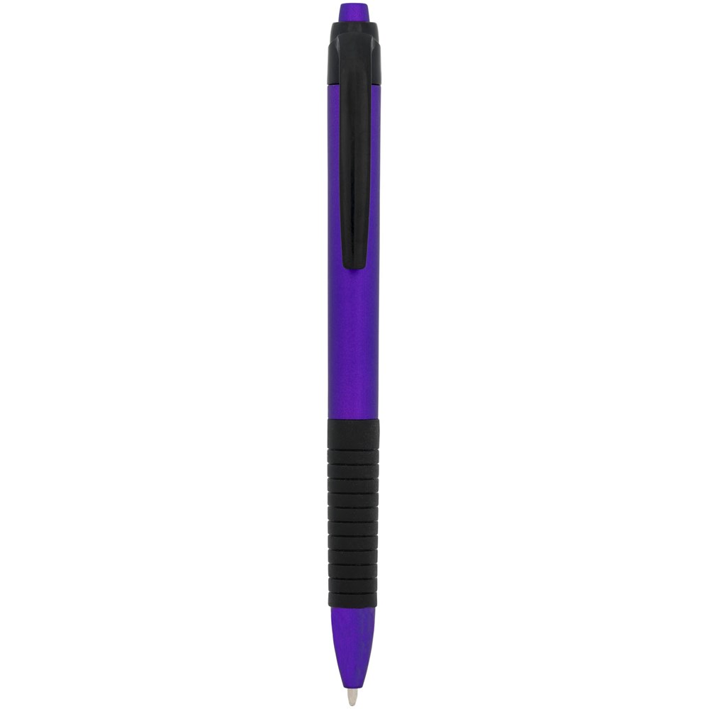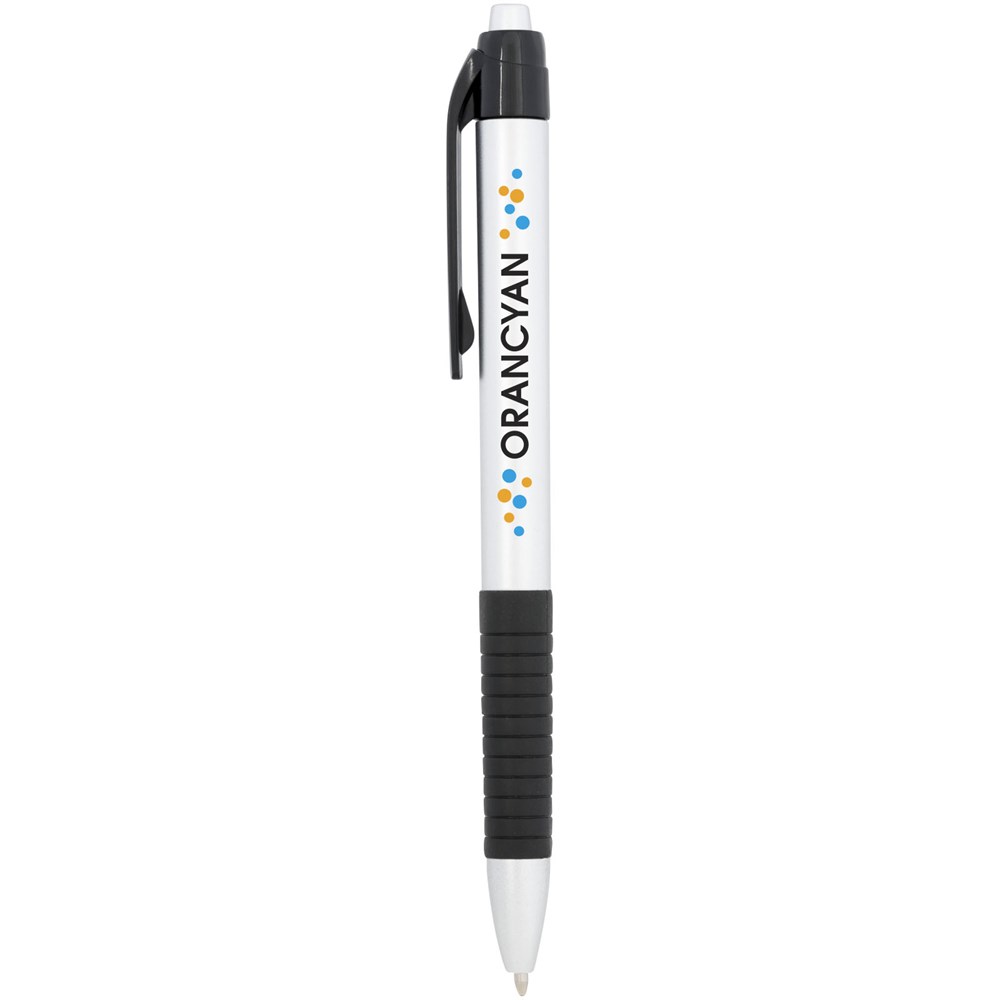 Klik balpen met metallic afwerking en rubberen grip. Blauwscrhrijvend.