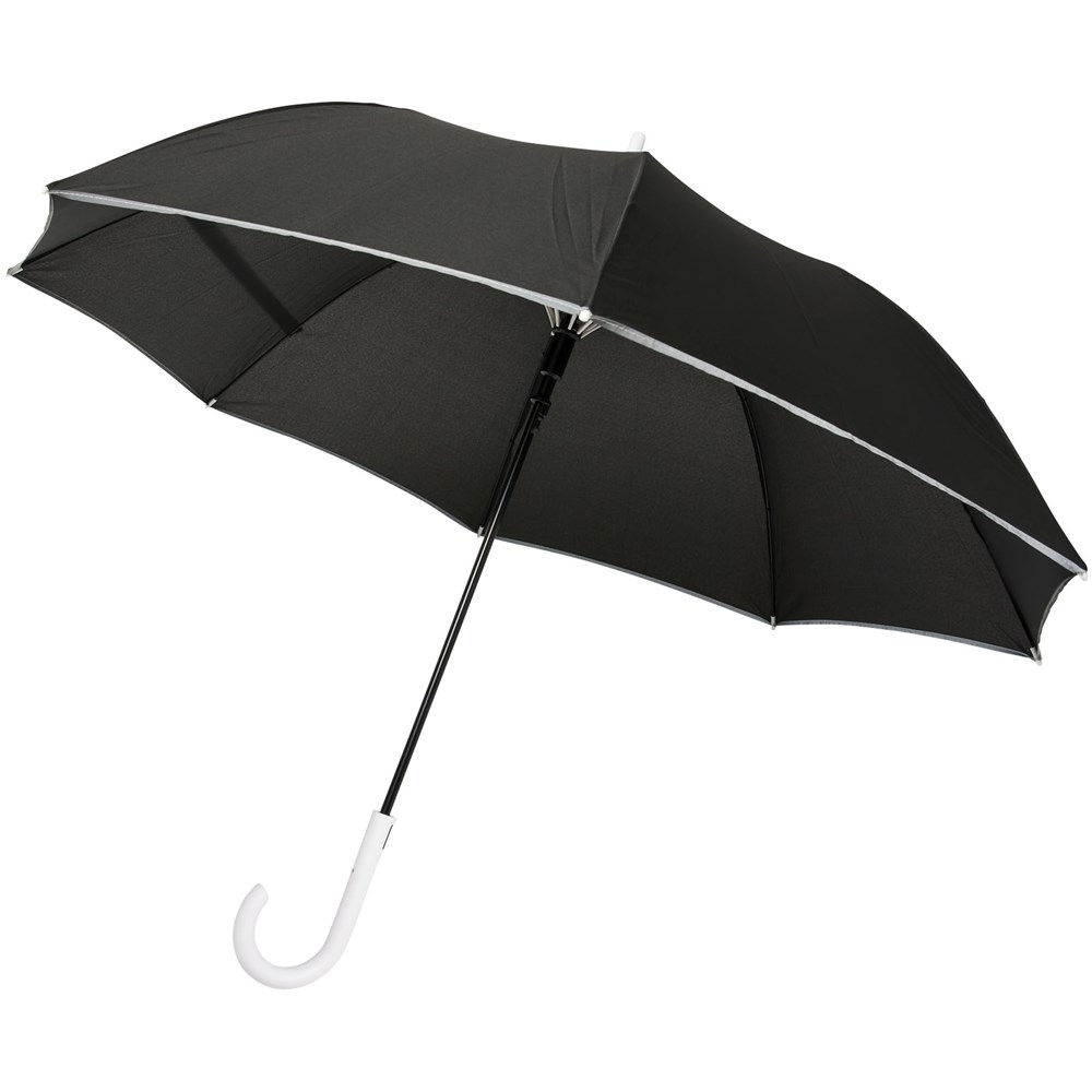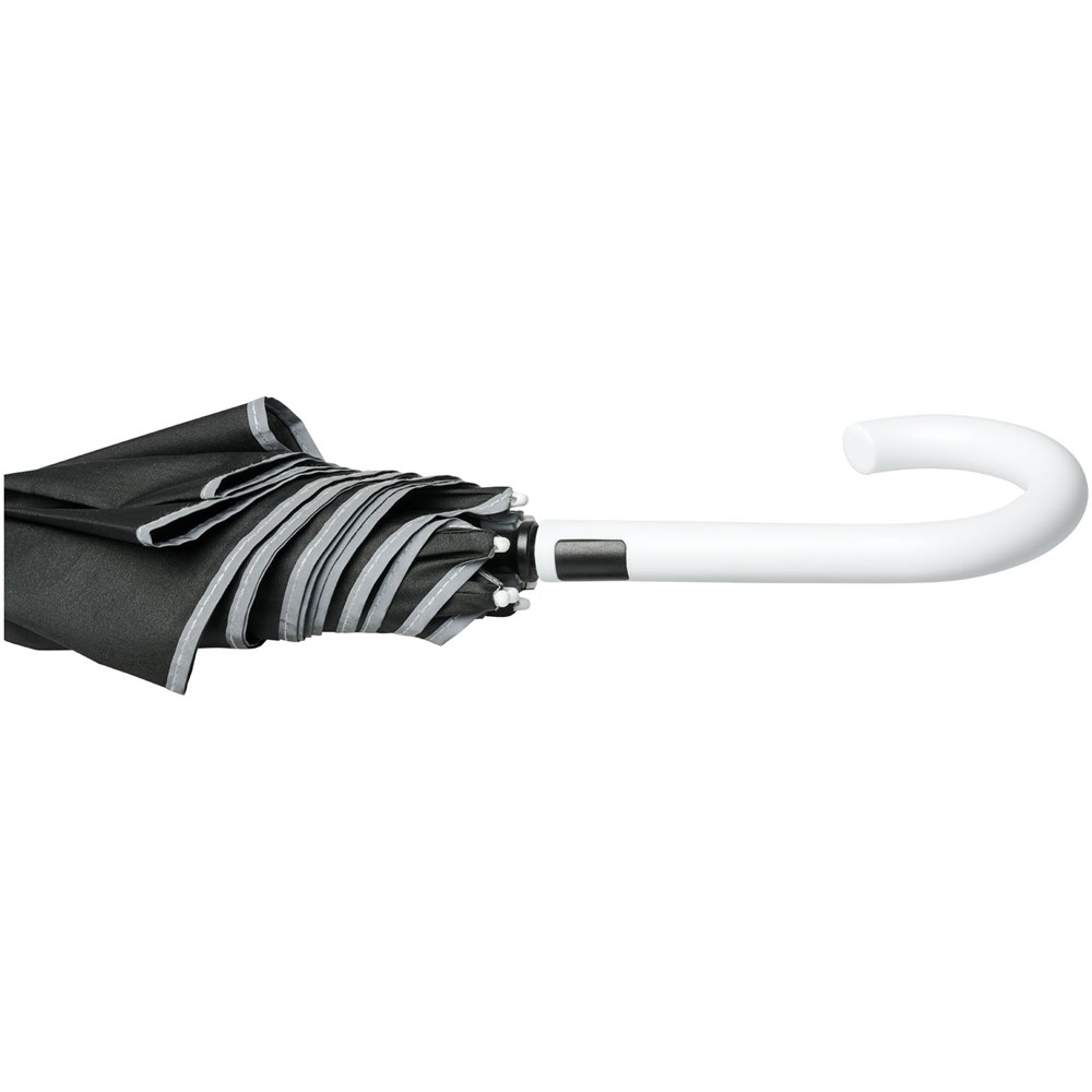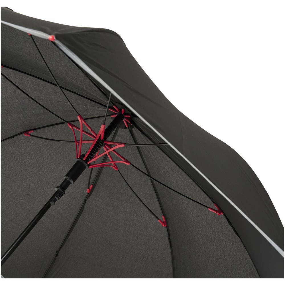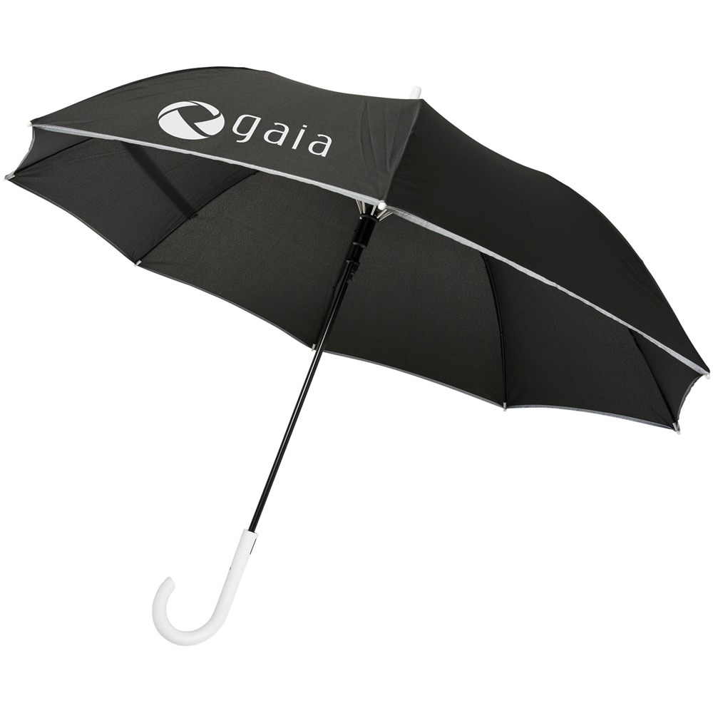 Felice 23" automatische en reflecterende stormparaplu. Automatisch openende paraplu met een pongé polyester scherm met reflecterende ribben. De stevige metalen schacht en het hoogwaardige frame volledig uit glasvezel bieden maximale flexibiliteit bij winderige omstandigheden. De kromme handgreep heeft een geïntegreerde drukknop. Het pongé polyester scherm is gemaakt van een reflecterende stof voor betere zichtbaarheid tijdens donkere momenten op een regenachtige dag. Gekleurde details zijn beschikbaar voor het glasvezel frame en worden door de handgreep, de punten en de spits geleid. Groot decoratievlak beschikbaar op elk van de panelen. Pongé polyester.