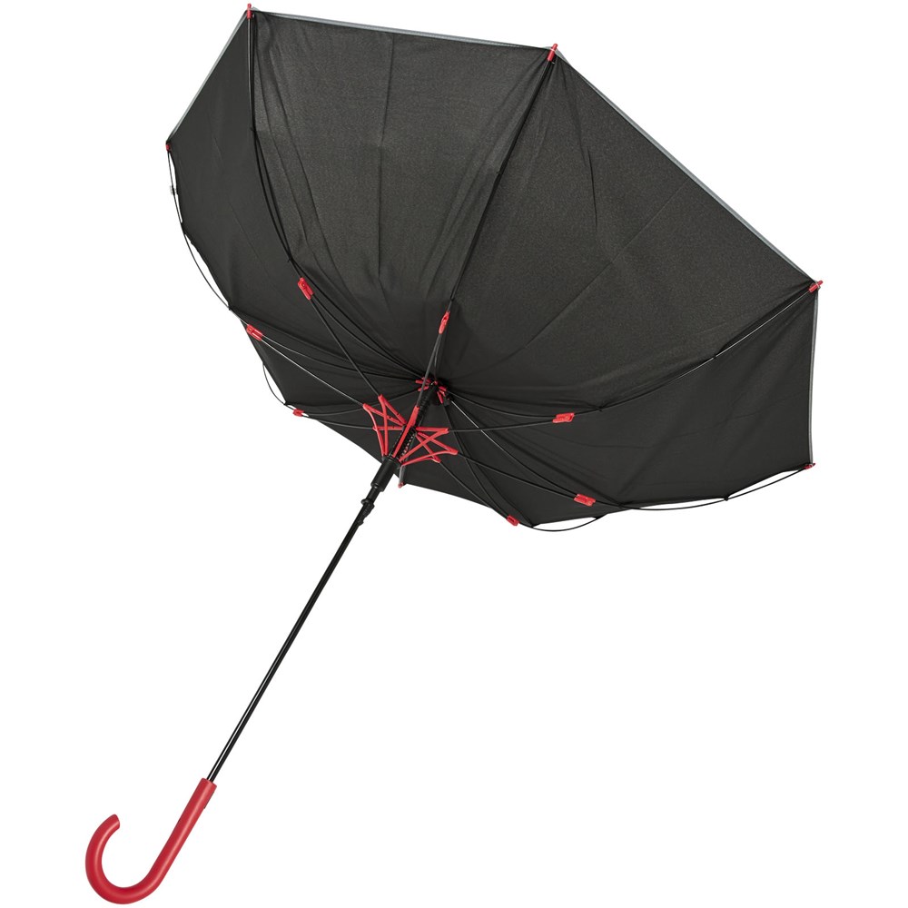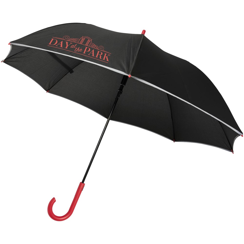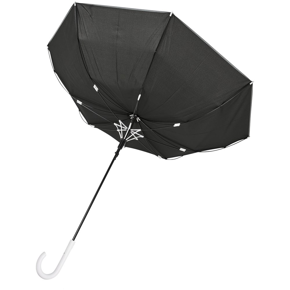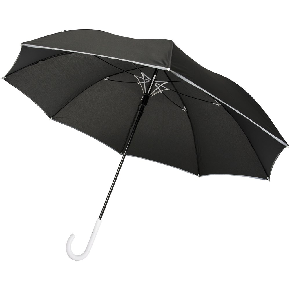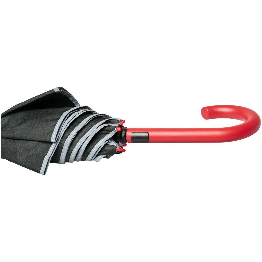 Felice 23" automatische en reflecterende stormparaplu. Automatisch openende paraplu met een pongé polyester scherm met reflecterende ribben. De stevige metalen schacht en het hoogwaardige frame volledig uit glasvezel bieden maximale flexibiliteit bij winderige omstandigheden. De kromme handgreep heeft een geïntegreerde drukknop. Het pongé polyester scherm is gemaakt van een reflecterende stof voor betere zichtbaarheid tijdens donkere momenten op een regenachtige dag. Gekleurde details zijn beschikbaar voor het glasvezel frame en worden door de handgreep, de punten en de spits geleid. Groot decoratievlak beschikbaar op elk van de panelen. Pongé polyester.