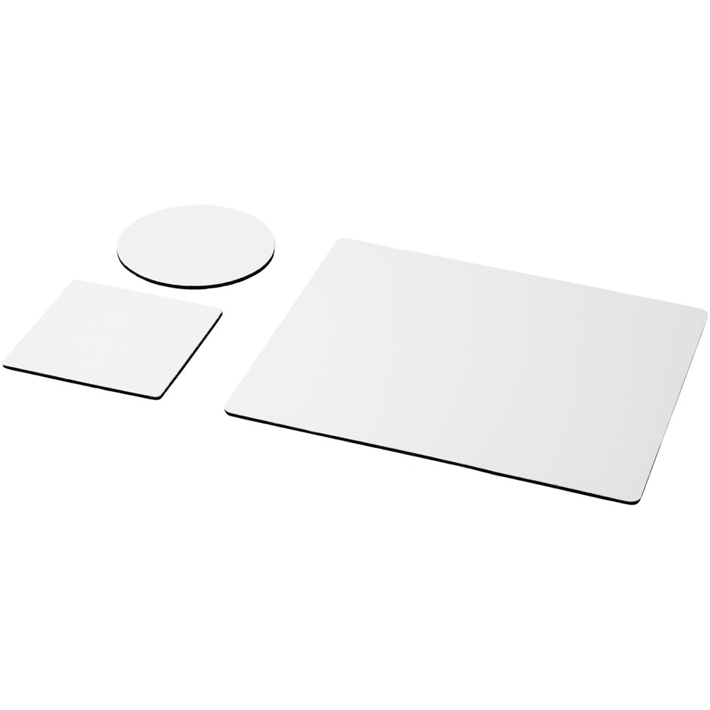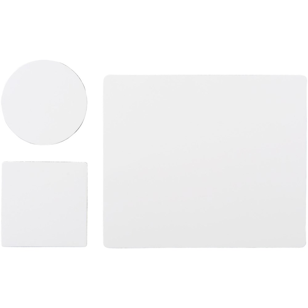 Beschikt over een Q-Mat muismat en een set van twee bijpassende onderzetters met het logo van je bedrijf. De set bestaat uit een rechthoekige muismat (0,3 x 23,5 x 20 cm), vierkante onderzetter (0,3 x 9,8 x 9,8 cm) en ronde onderzetter (0,3 x ø9,8 cm).