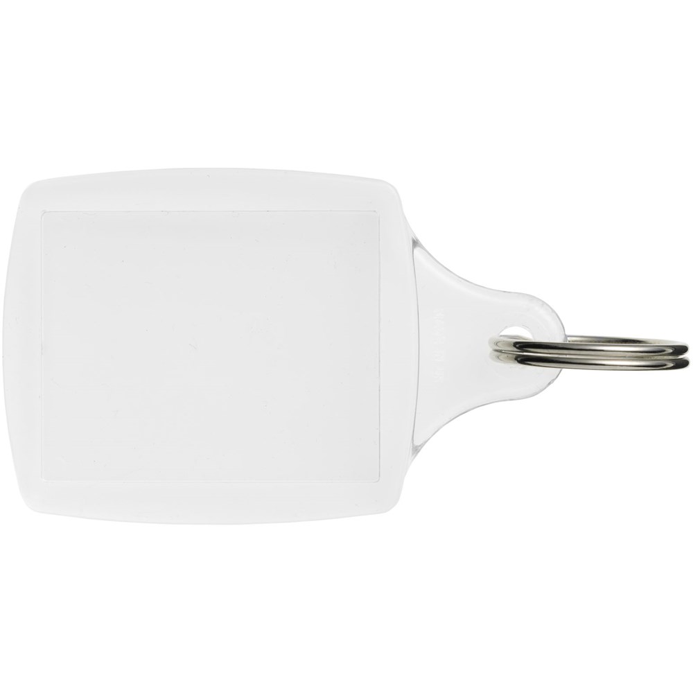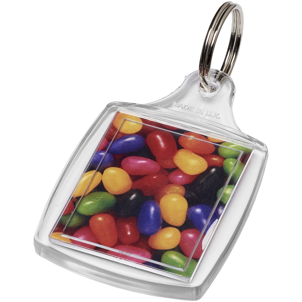 Doorzichtige S5 sleutelhanger met metalen sleutelring . Afmetingen van het te bedrukken inzetstuk: 4,0 cm x 3,2 cm.