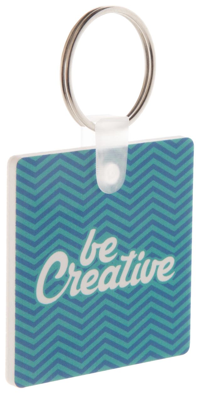 Vierkante sleutelhanger van PVC-schuim met full colour bedrukking. Prijs is inclusief UV-bedrukking. MOQ: 200 stks.