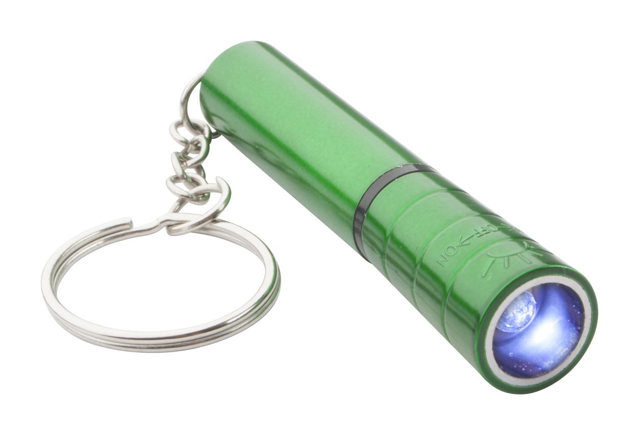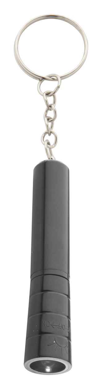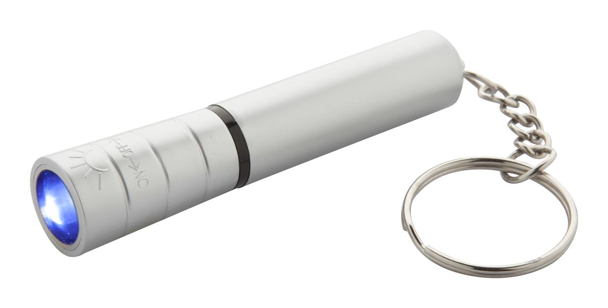 Plastic mini zaklamp met led verlichtigng metaal look en metalen ring. Inclusief batterij.