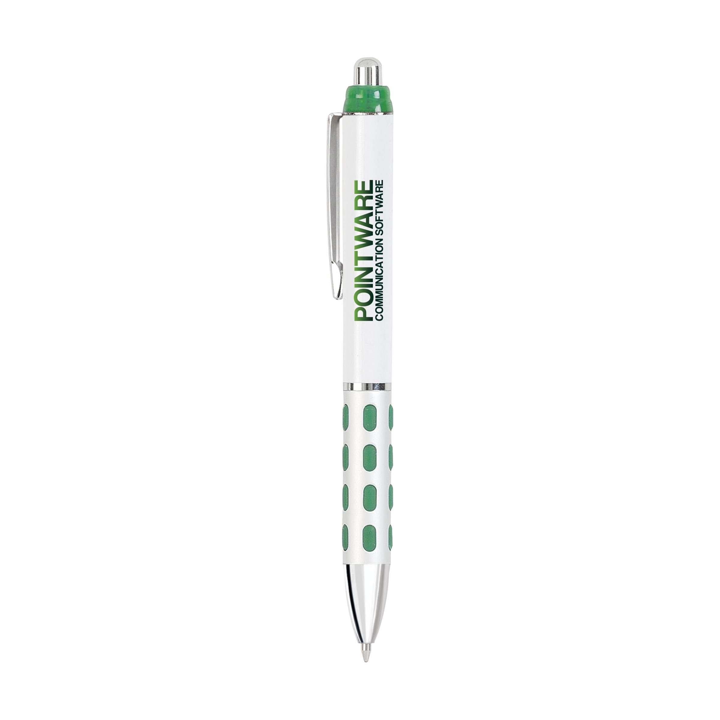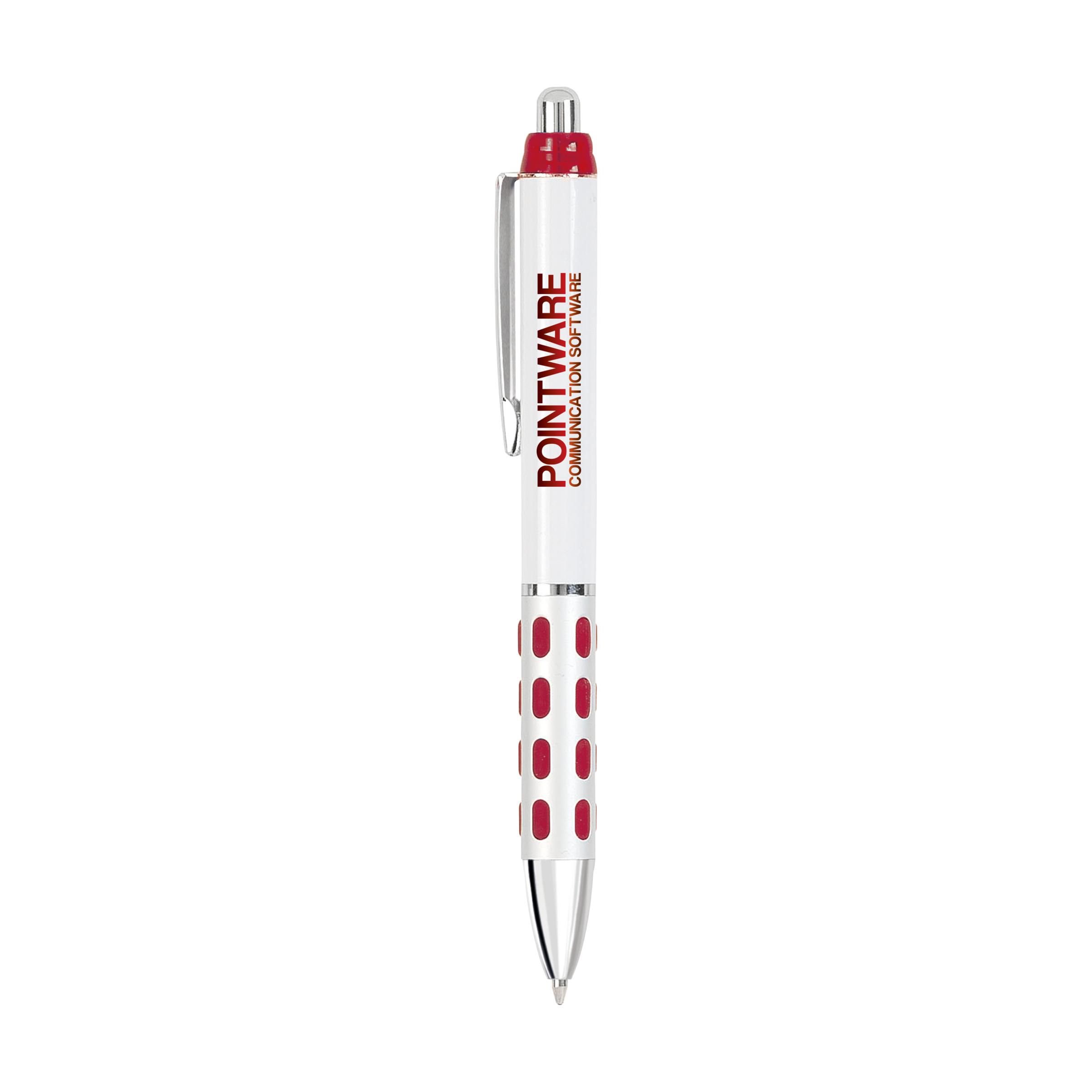 Blauwschrijvende balpen met aluminium, gripvast voorstuk met rubberen accenten.