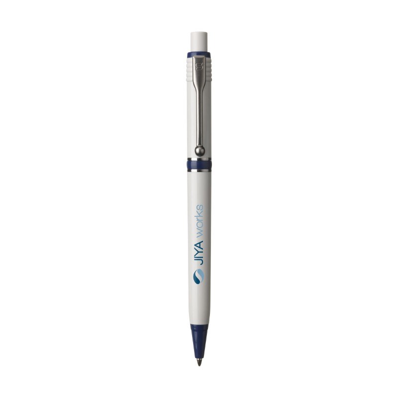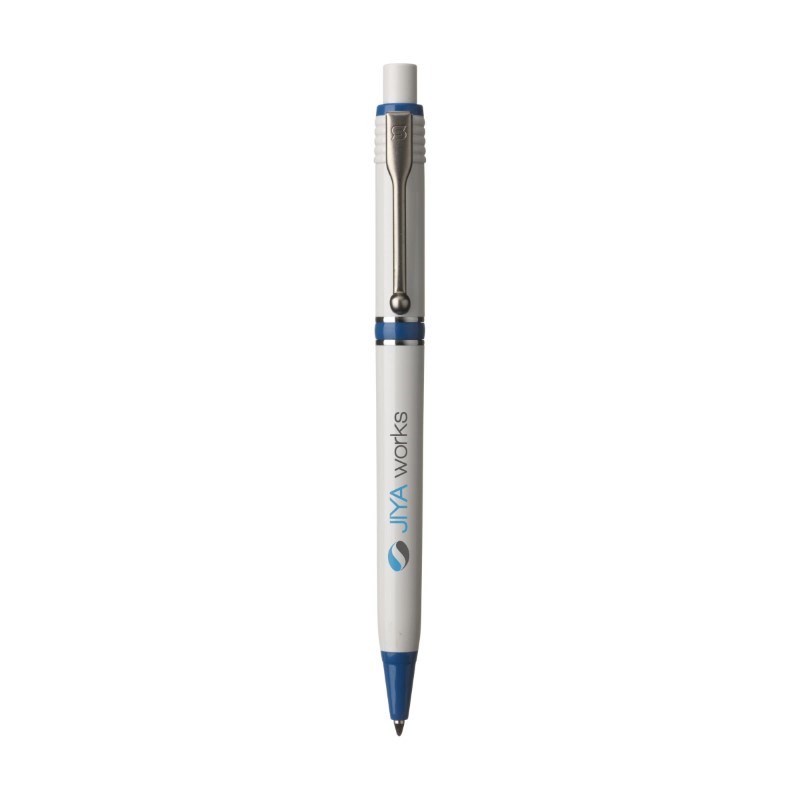 Blauwschrijvende balpen van het merk Stilolinea. Met kleuraccenten, metalen clip en tussenringen. Made in Italy.